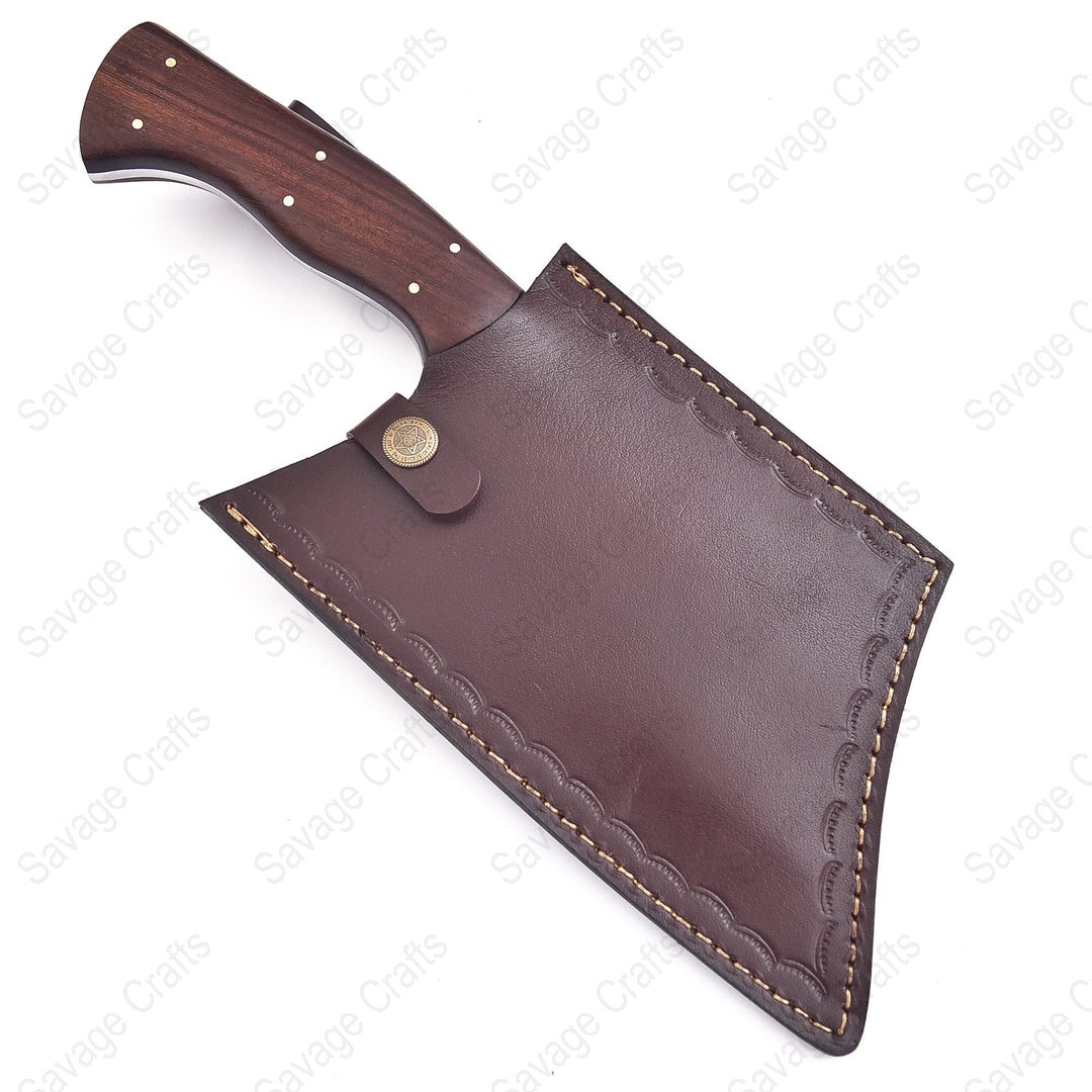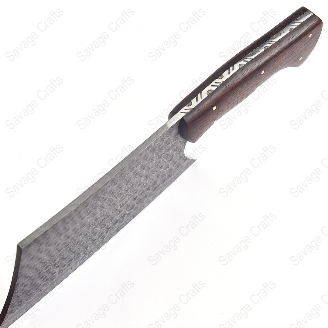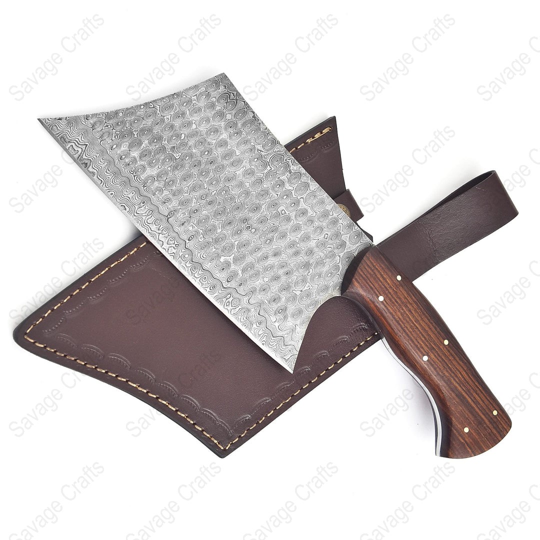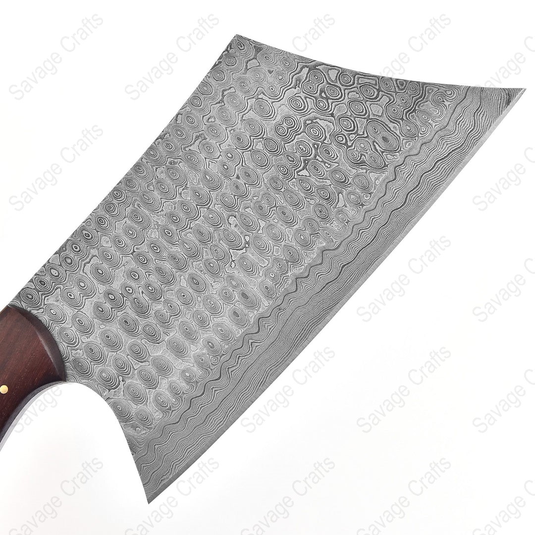 A heavy-duty cleaver made from Damascus steel is a powerful and visually striking tool designed for tough kitchen and butchery tasks. Its blade is crafted from multiple layers of folded steel, giving it exceptional durability, edge retention, and a unique wavy pattern that enhances its aesthetic appeal. The cleaver’s thick, weighted blade allows it to cut through dense ingredients, such as large cuts of meat, cartilage, and small to medium bones with minimal effort, making it ideal for heavy chopping and breaking down whole poultry or meat. Damascus steel also provides a good balance of sharpness and flexibility, reducing the likelihood of chipping during high-impact use. In addition to meat preparation, the cleaver can handle hard vegetables like squash and sweet potatoes and can be used to crush garlic or scoop ingredients thanks to its wide blade. Overall, a Damascus steel heavy-duty cleaver combines strength, performance, and beauty, making it a preferred choice for chefs, butchers, grilling enthusiasts, and home cooks who want a reliable and premium cutting tool.
