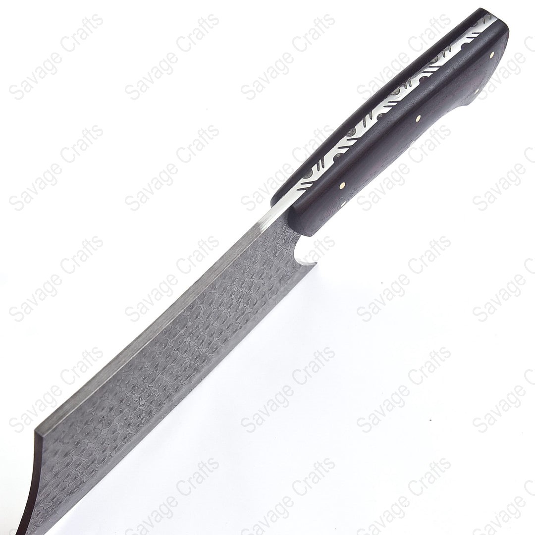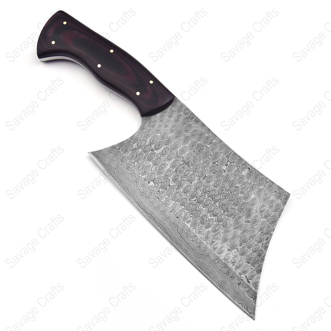 A heavy-duty cleaver made from Damascus steel is a powerful and visually striking tool designed for tough kitchen and butchery tasks. Its blade is crafted from multiple layers of folded steel, giving it exceptional durability, edge retention, and a unique wavy pattern that enhances its aesthetic appeal. The cleaver’s thick, weighted blade allows it to cut through dense ingredients, such as large cuts of meat, cartilage, and small to medium bones with minimal effort, making it ideal for heavy chopping and breaking down whole poultry or meat. Damascus steel also provides a good balance of sharpness and flexibility, reducing the likelihood of chipping during high-impact use. In addition to meat preparation, the cleaver can handle hard vegetables like squash and sweet potatoes and can be used to crush garlic or scoop ingredients thanks to its wide blade. Overall, a Damascus steel heavy-duty cleaver combines strength, performance, and beauty, making it a preferred choice for chefs, butchers, grilling enthusiasts, and home cooks who want a reliable and premium cutting tool.