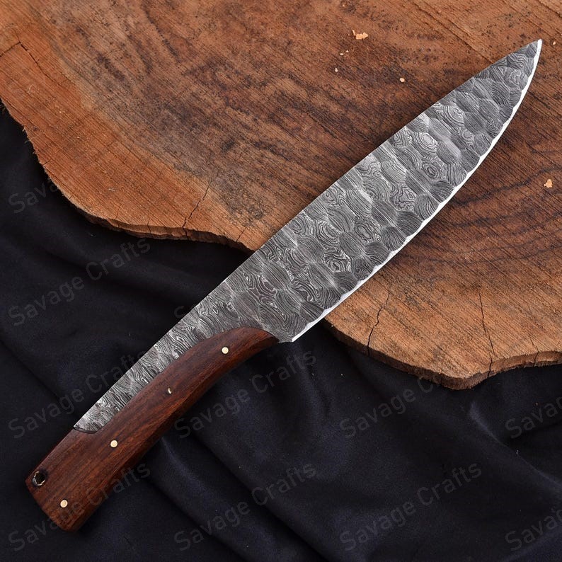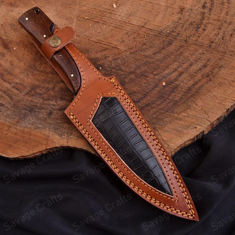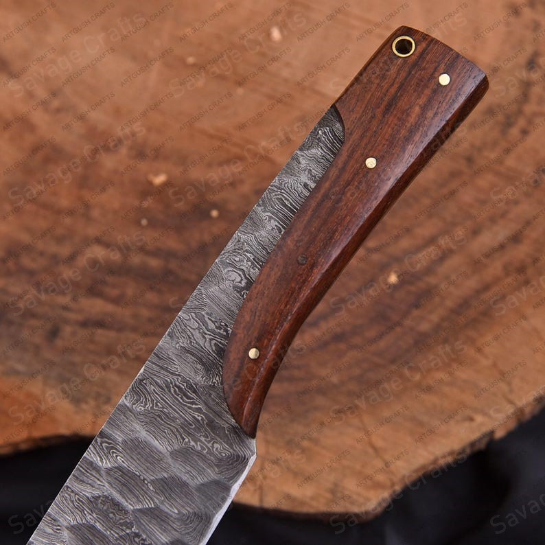 Whether navigating the great outdoors, embarking on a wilderness adventure, or enhancing a fine cutlery collection, this knife exemplifies superior craftsmanship and timeless design. Forged from premium Damascus steel, the blade combines striking aesthetics with exceptional strength, durability, edge retention, and corrosion resistance, ensuring reliable performance in even the most demanding conditions. Its ergonomic handle, meticulously crafted from grained hardwood, provides a secure and comfortable grip for extended use, making it ideal for tasks such as food preparation, carving wood, rope cutting, and crafting survival tools.