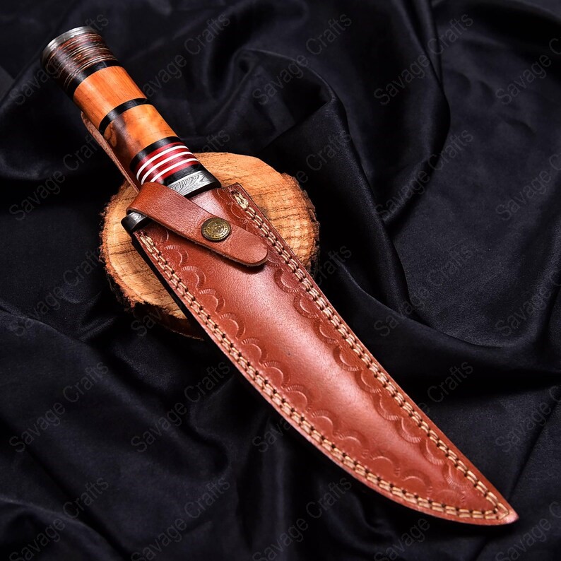 Whether navigating the great outdoors, embarking on a wilderness adventure, or enhancing a fine cutlery collection, this knife exemplifies superior craftsmanship and timeless design. Forged from premium Damascus steel, the blade combines striking aesthetics with exceptional strength, durability, edge retention, and corrosion resistance, ensuring reliable performance in even the most demanding conditions. Its ergonomic handle, meticulously crafted from grained hardwood, provides a secure and comfortable grip for extended use, making it ideal for tasks such as food preparation, carving wood, rope cutting, and crafting survival tools.