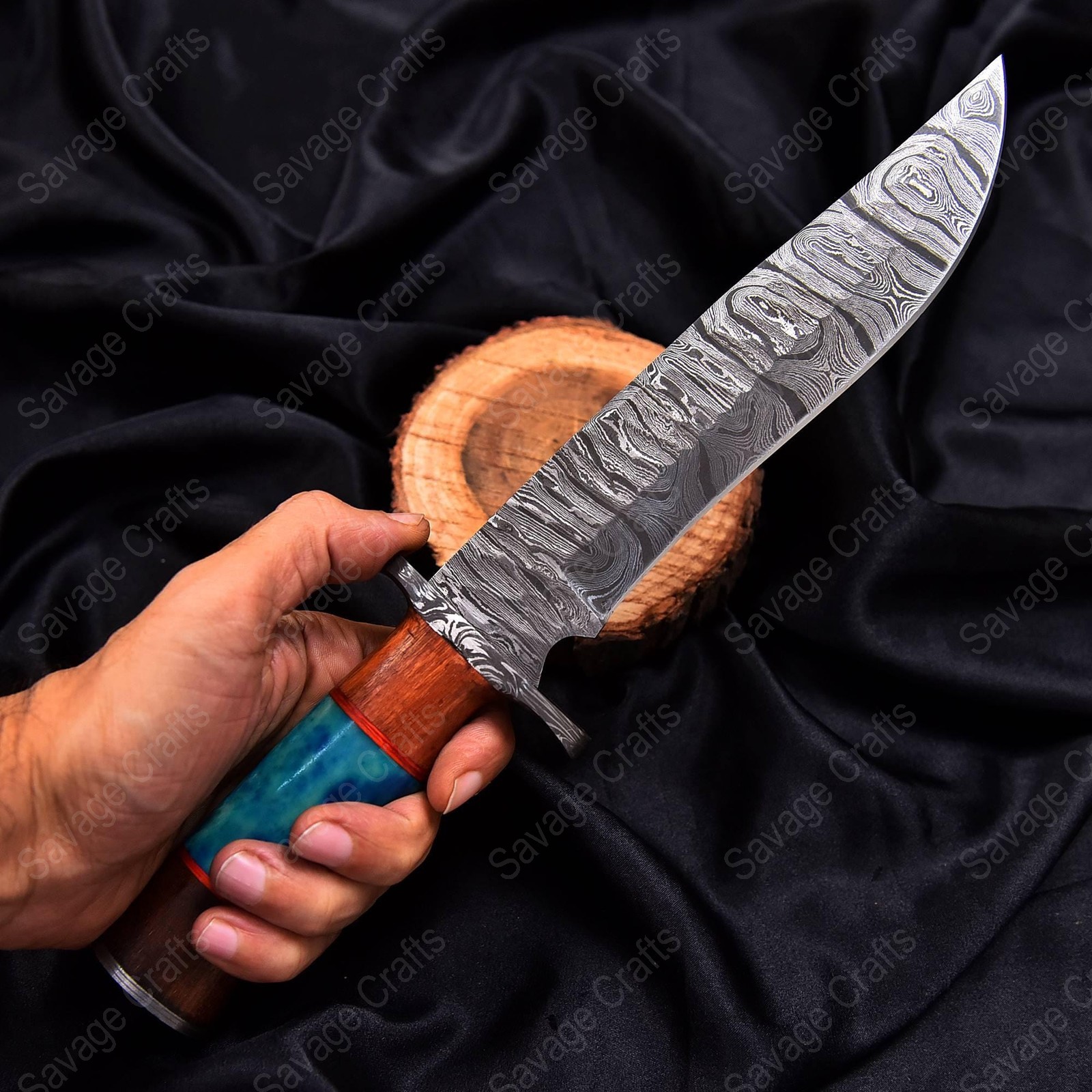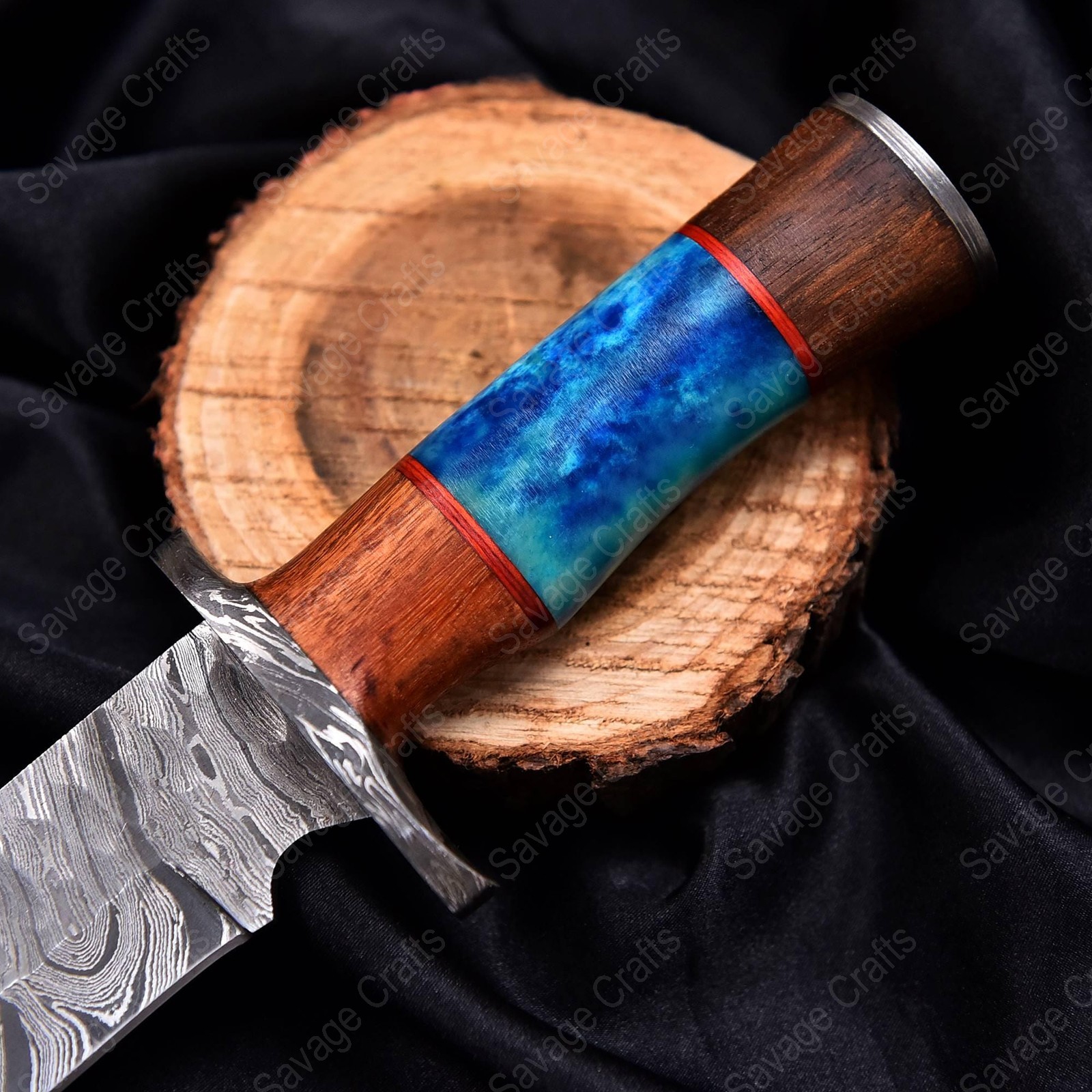 Whether navigating the great outdoors, embarking on a wilderness adventure, or enhancing a fine cutlery collection, this knife exemplifies superior craftsmanship and timeless design. Forged from premium Damascus steel, the blade combines striking aesthetics with exceptional strength, durability, edge retention, and corrosion resistance, ensuring reliable performance in even the most demanding conditions. Its ergonomic handle, meticulously crafted from grained hardwood, provides a secure and comfortable grip for extended use, making it ideal for tasks such as food preparation, carving wood, rope cutting, and crafting survival tools.