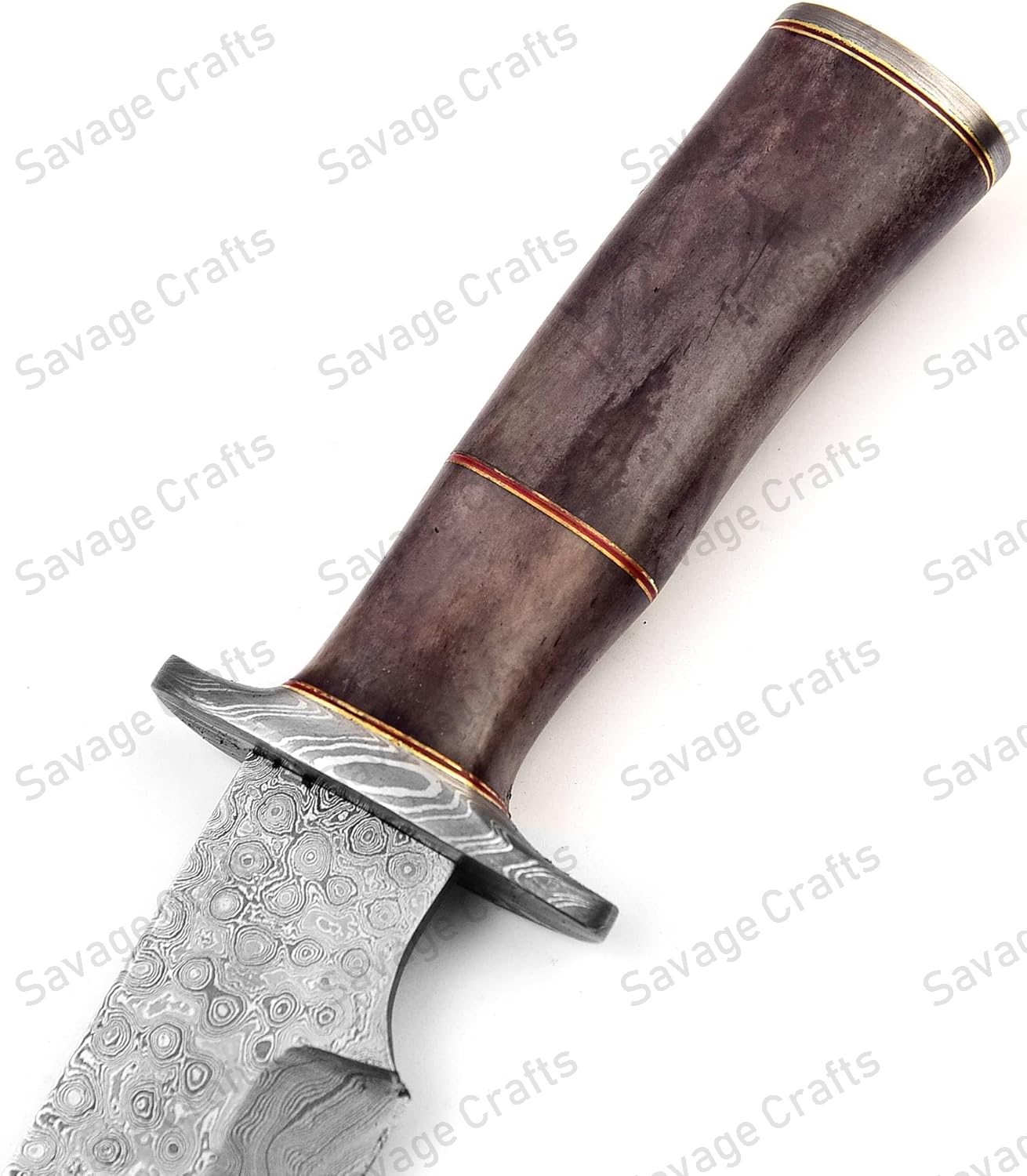 - Handle Material: Damascus Guard & End Cap, Dyed Bone, Brass Spacers