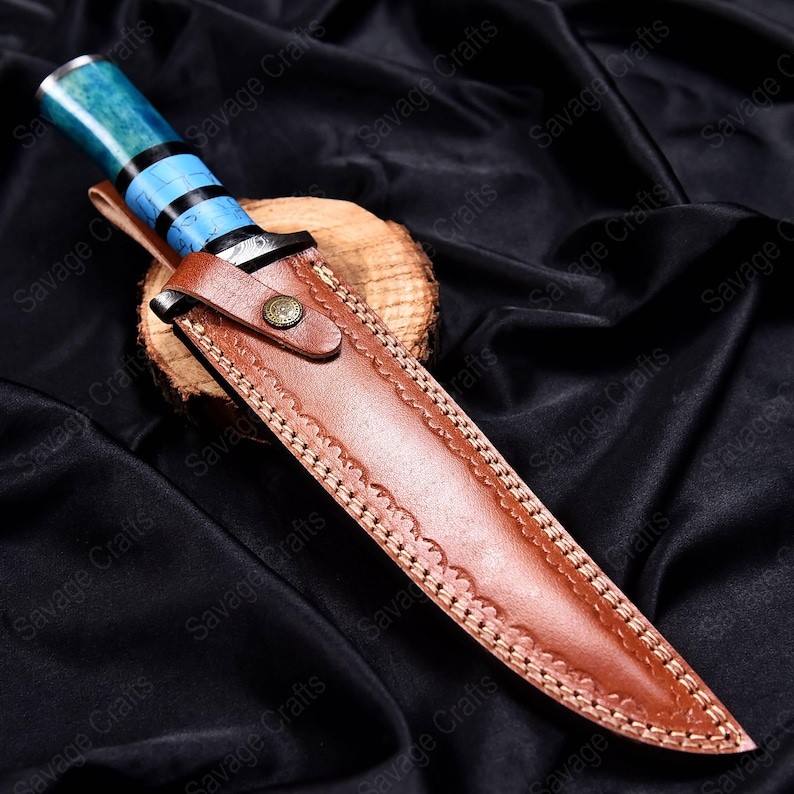 - Handle Material: Damascus guard & End cap, Dyed Bone, Resin, Pakka Wood