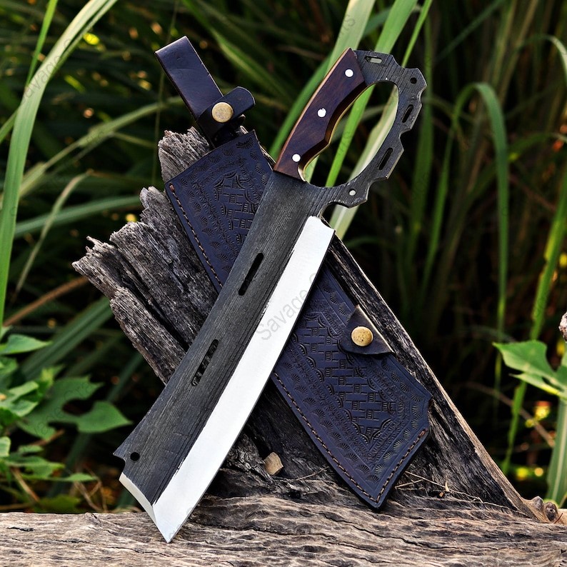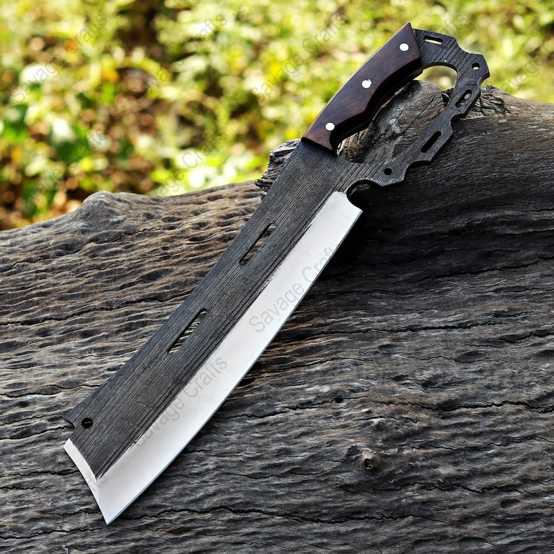 An outdoor machete knife is a versatile cutting tool designed with a long, broad blade, typically made of 1095 Carbon Steel to handle tough outdoor tasks. Its weight-forward balance and durable full-tang construction allow for powerful chopping, while the ergonomic handle provides a secure grip during extended use. Many machetes also include features like serrated back edges for light sawing and a protective sheath for safe carrying.