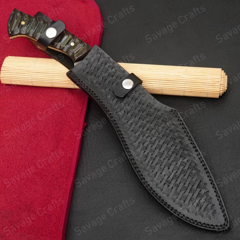 Ergonomically contoured handles—often made from hardwood, horn, or micarta. ensure a secure, comfortable grip even in demanding conditions. Additional features such as a full-tang construction for enhanced durability, a well-balanced spine for precision control, and a handcrafted leather or wood sheath for safe carry further underscore the kukri’s blend of functionality, craftsmanship, and enduring cultural significance.