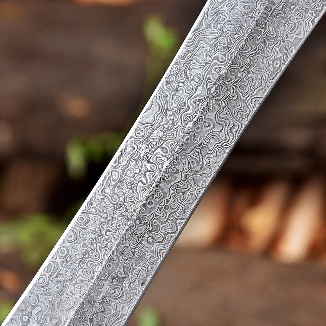 A sword made from Damascus steel is known for its distinctive beauty, historical significance, and well-rounded performance characteristics. Damascus steel is created by forging multiple layers of steel together, producing a blade with exceptional strength and a signature flowing or wavy pattern. This layered construction gives the sword a combination of toughness, flexibility, and excellent edge retention, making it less likely to chip or break under stress. The blade’s hardness allows it to hold a sharp edge for a long time, while its resilience helps absorb impact during use. Many Damascus swords also feature ornate, hand-crafted patterns and elegant handles, making them as visually impressive as they are functional.
