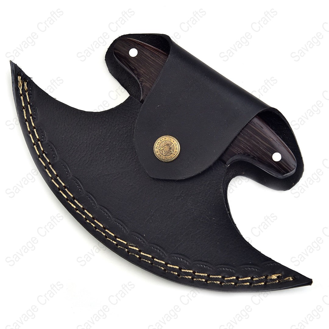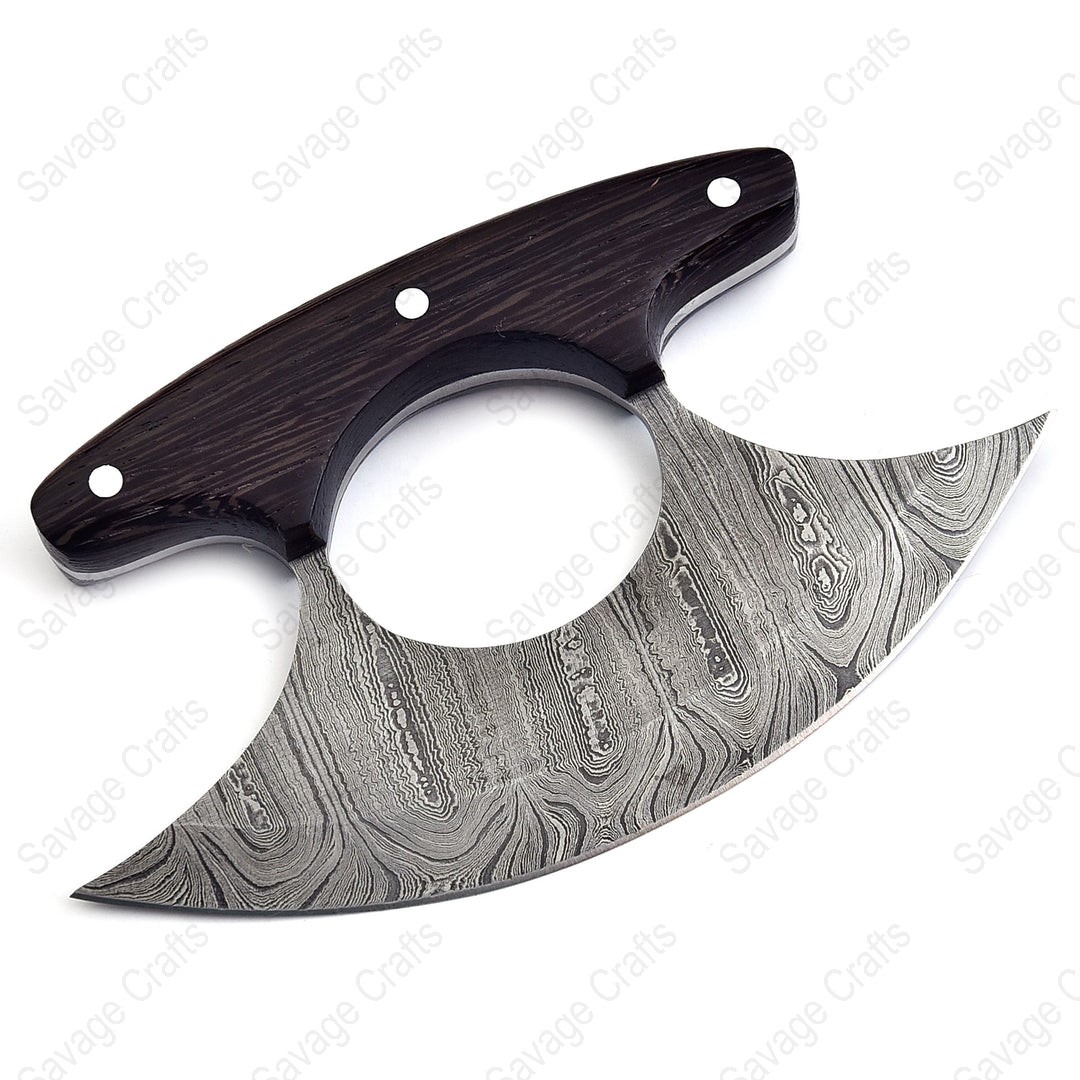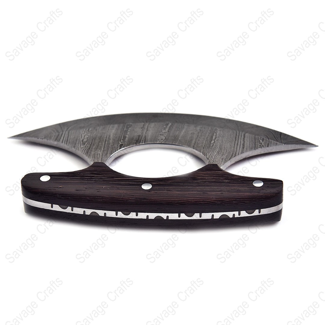 Crafted from swirling Damascus steel, this Ulu knife features a distinctive curved profile engineered for exceptional performance even in extreme cold. In everyday environments—such as the kitchen—its sweeping blade and ergonomically positioned handle provide outstanding control and efficiency for tasks like chopping garlic and herbs, slicing vegetables, and even cutting pizza.