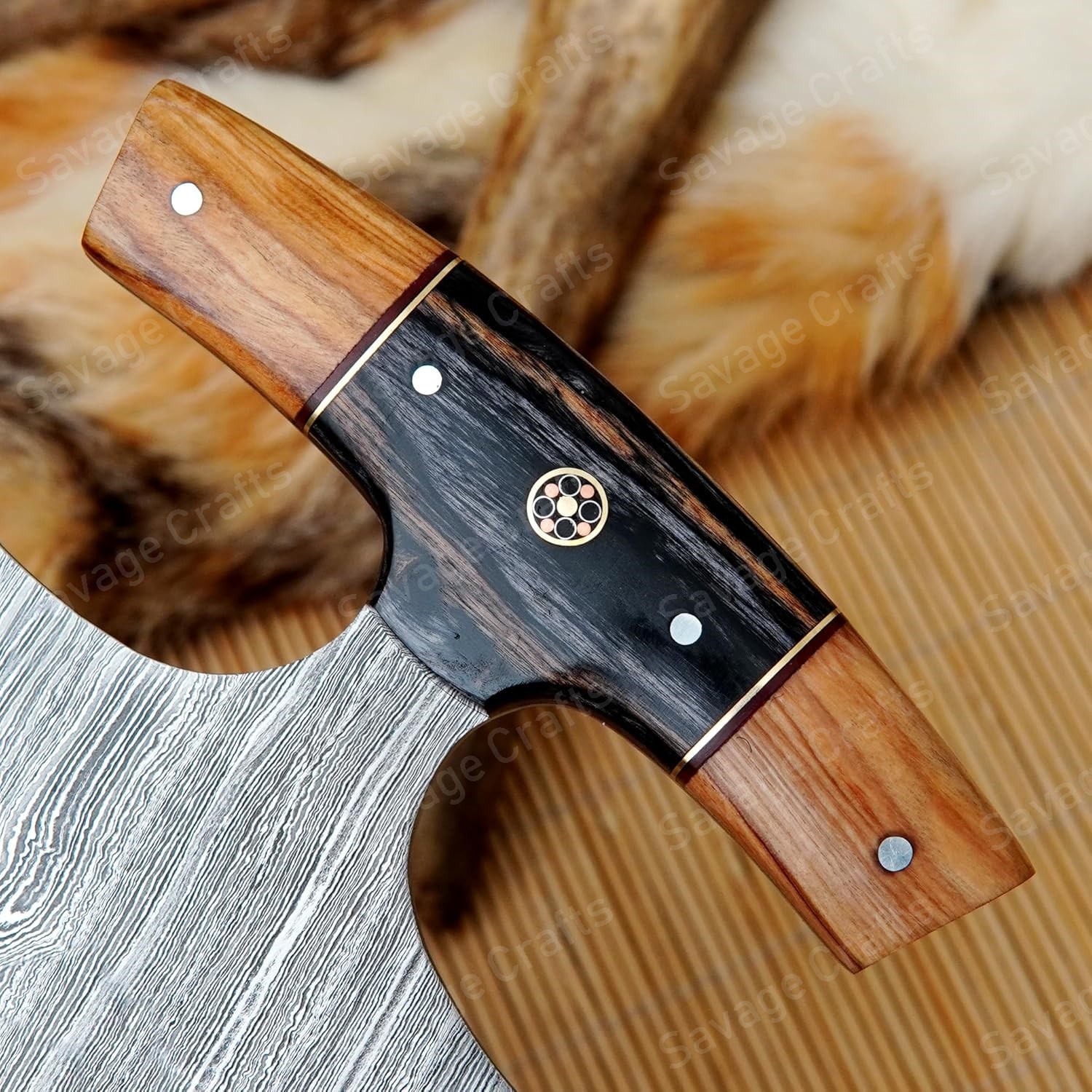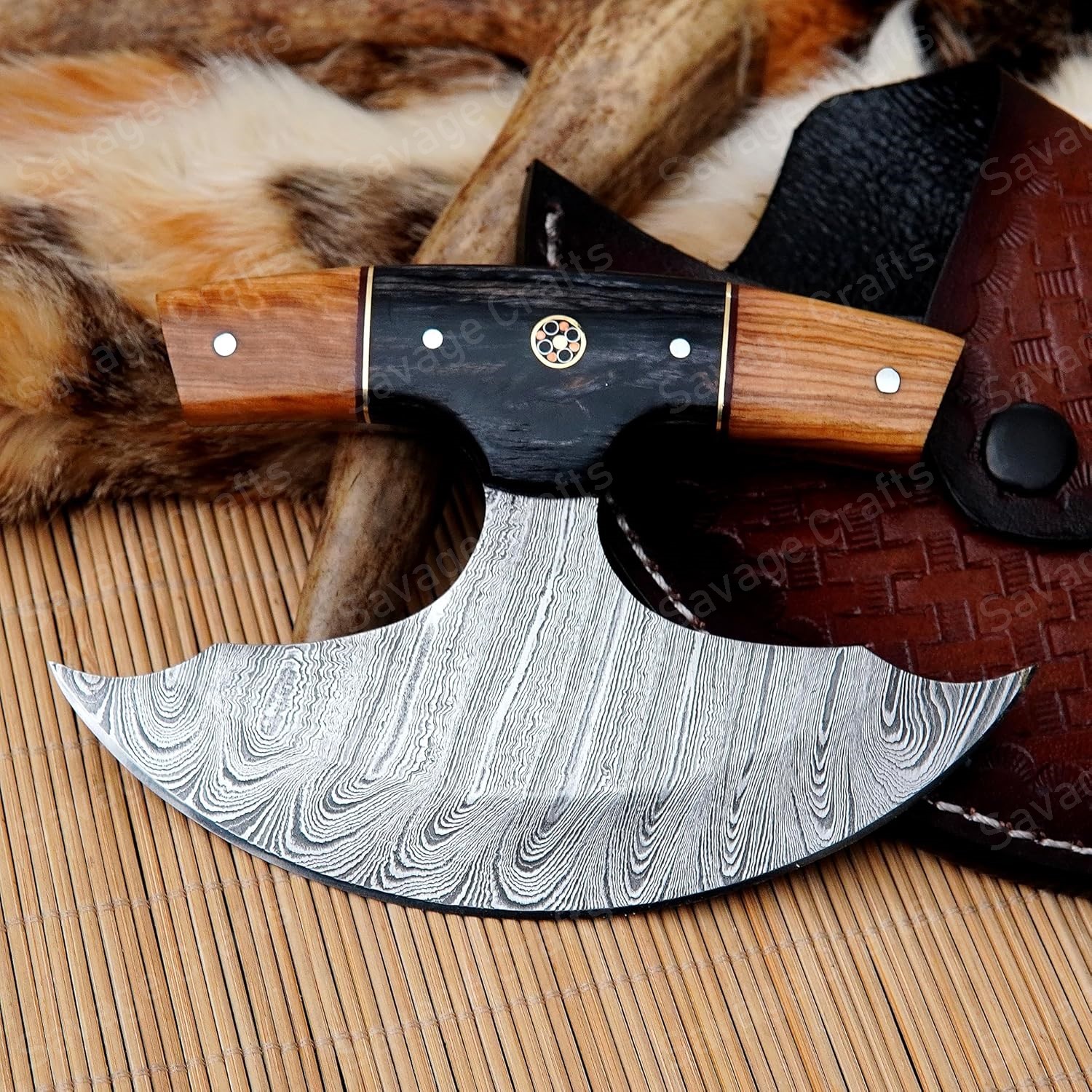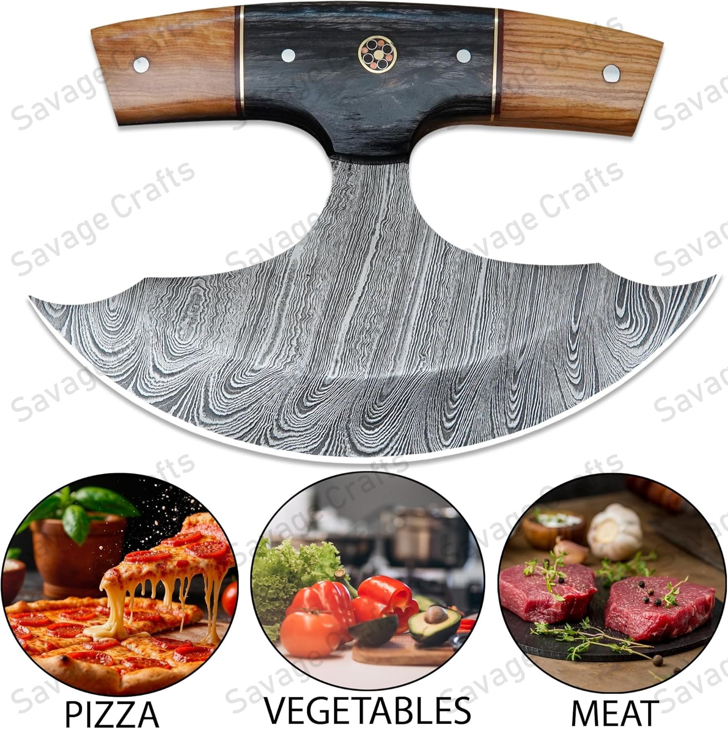 Crafted from swirling Damascus steel, this Ulu knife features a distinctive curved profile engineered for exceptional performance even in extreme cold. In everyday environments—such as the kitchen—its sweeping blade and ergonomically positioned handle provide outstanding control and efficiency for tasks like chopping garlic and herbs, slicing vegetables, and even cutting pizza.