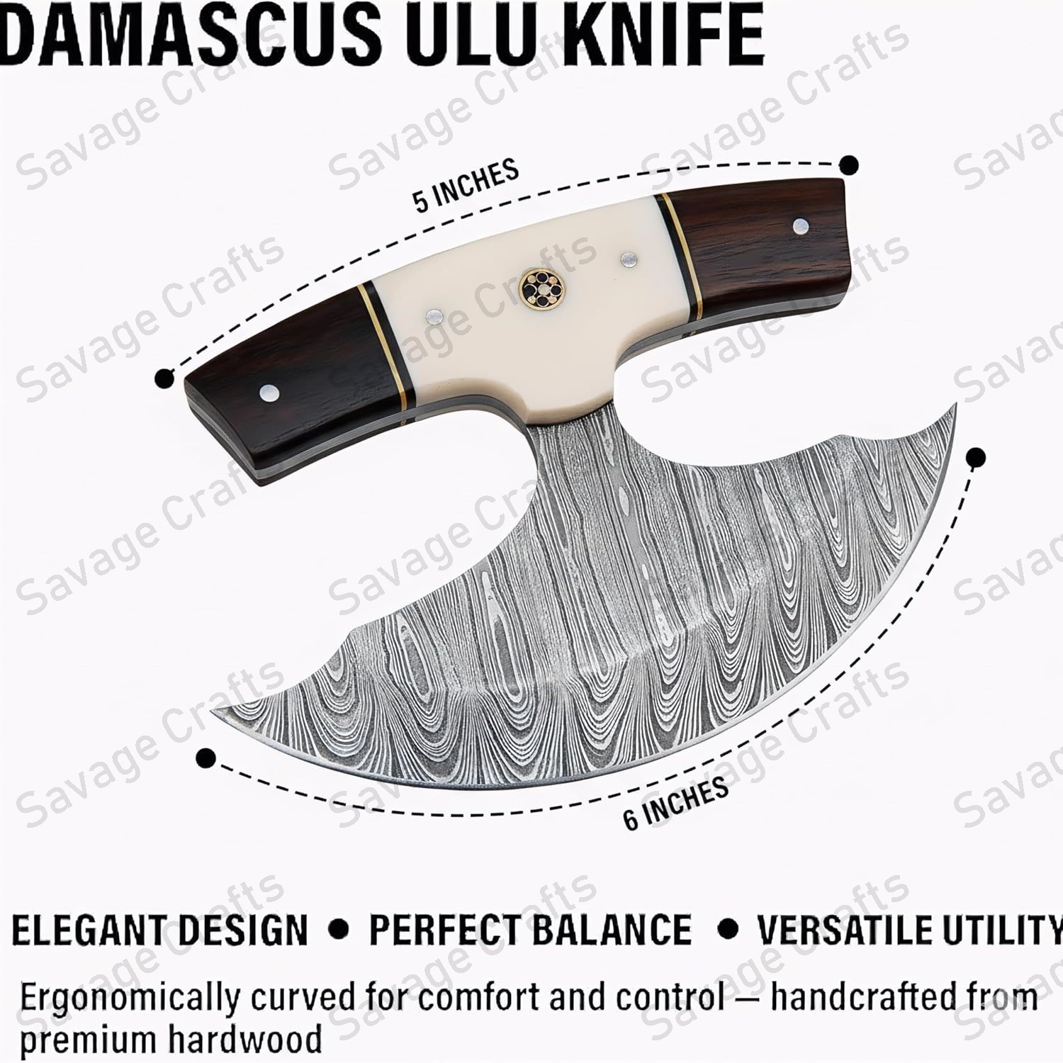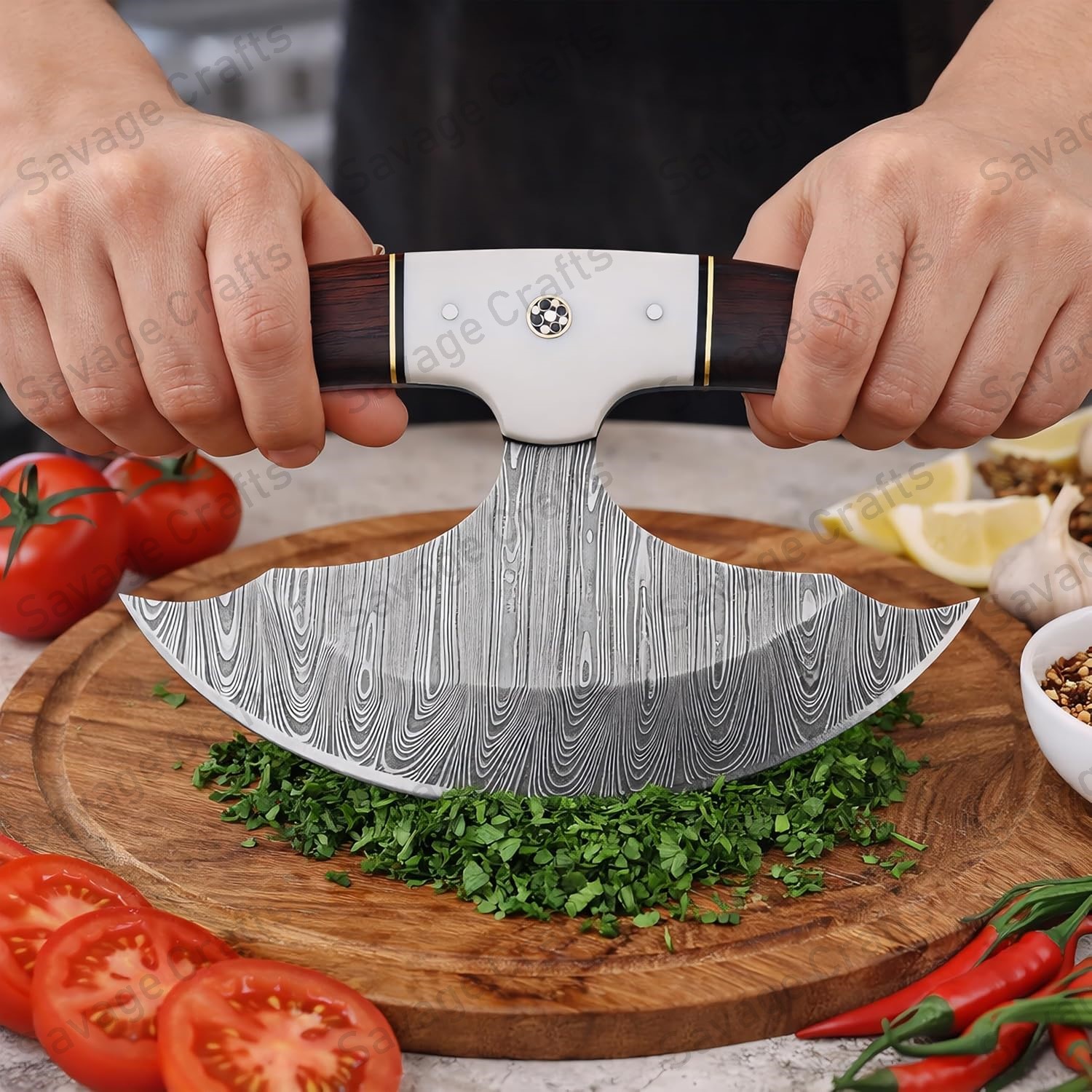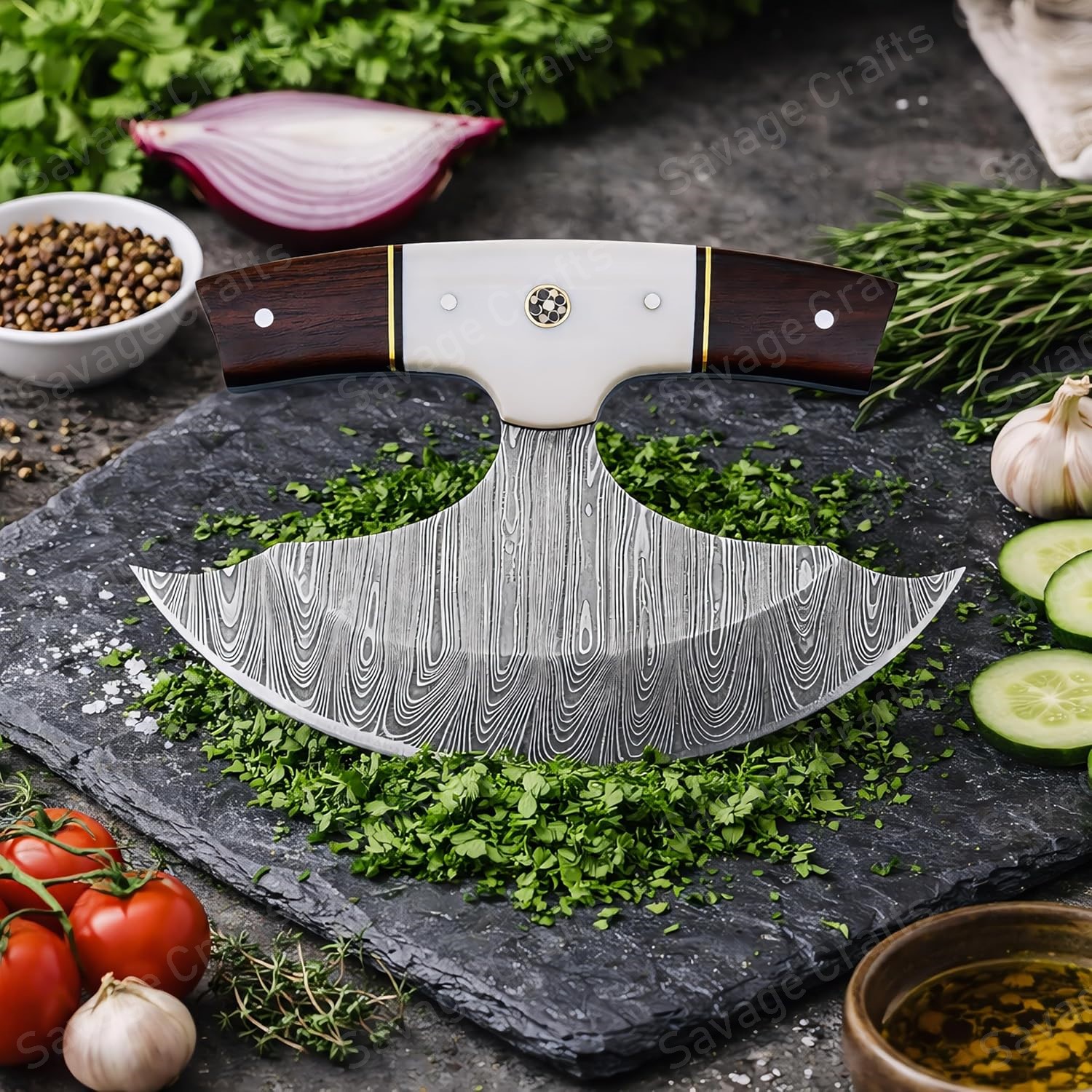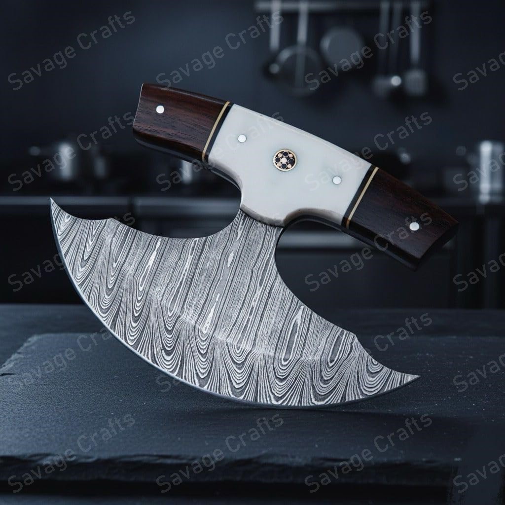 Crafted from swirling Damascus steel, this Ulu knife features a distinctive curved profile engineered for exceptional performance even in extreme cold. In everyday environments—such as the kitchen—its sweeping blade and ergonomically positioned handle provide outstanding control and efficiency for tasks like chopping garlic and herbs, slicing vegetables, and even cutting pizza.
