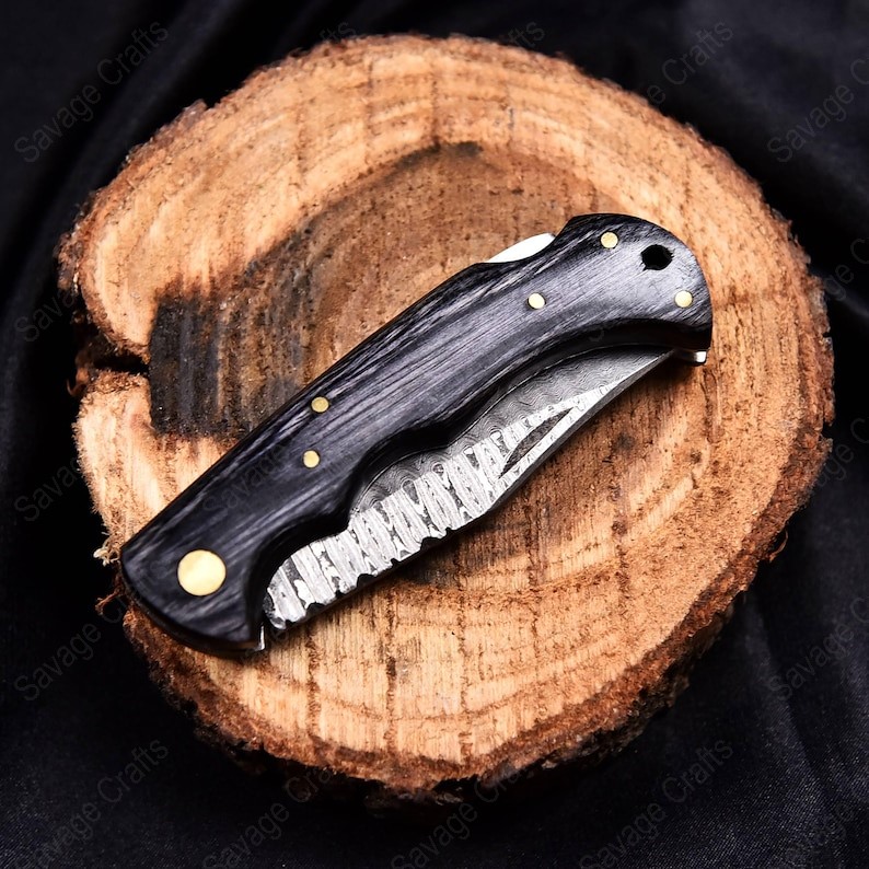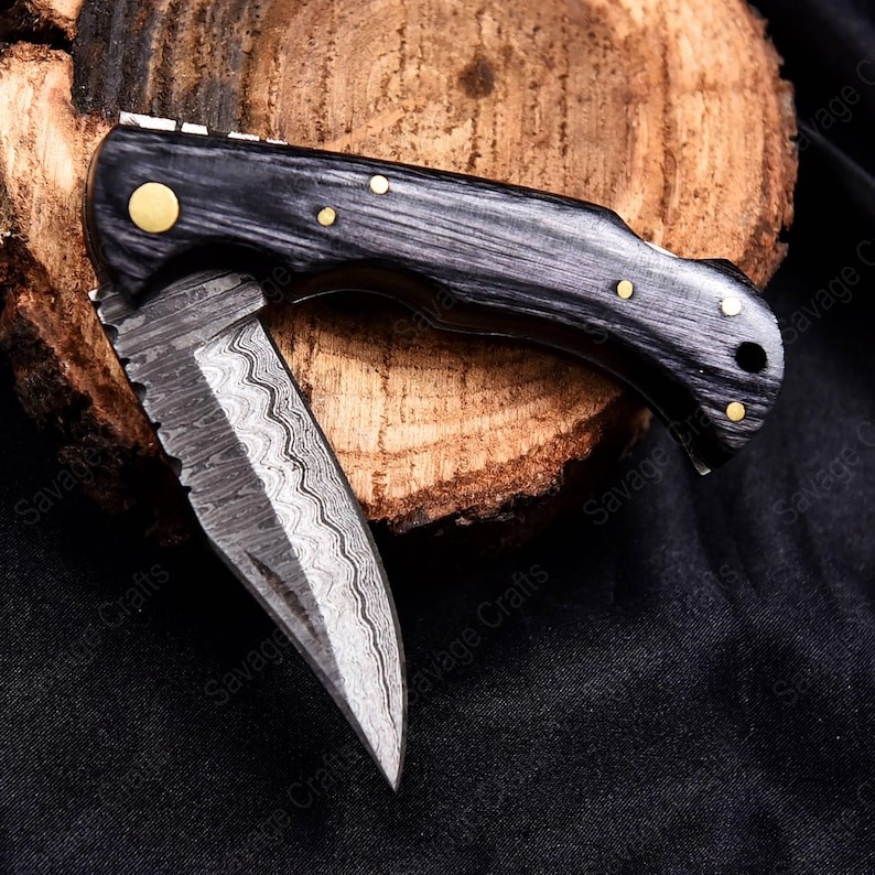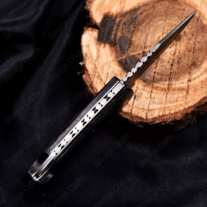 Crafted with an ultra-sharp, hand-forged Damascus steel blade, this folding knife exemplifies the enduring value of traditional metalworking. Damascus steel offers superior durability compared to standard high-carbon steels and allows for easier sharpening, thanks to its balanced blend of high-chromium and alloying elements.