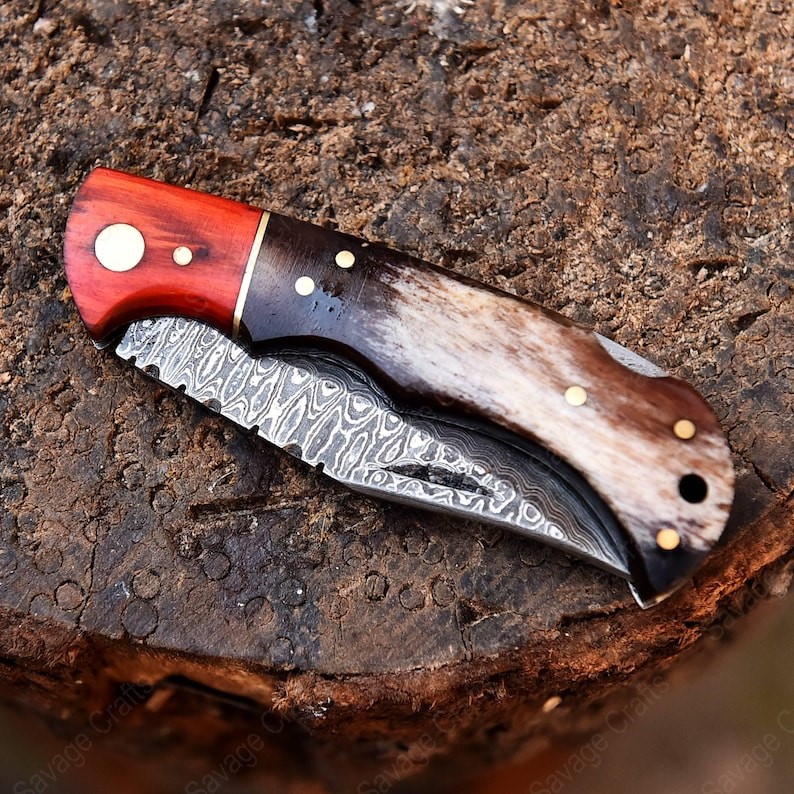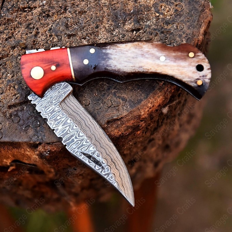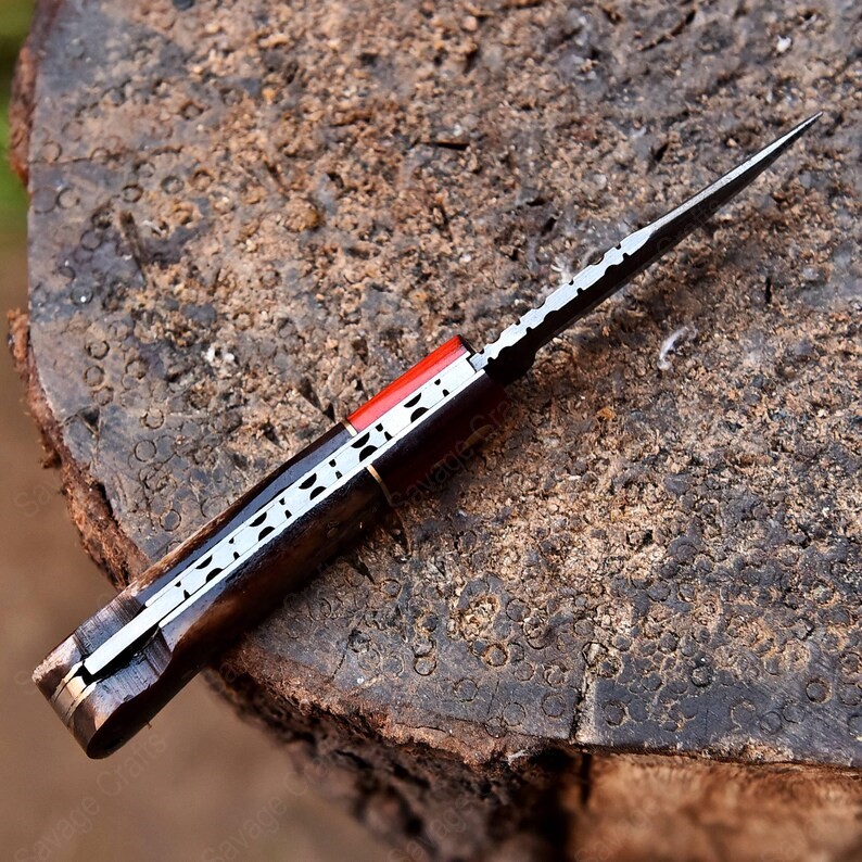 Crafted with an ultra-sharp, hand-forged Damascus steel blade, this folding knife exemplifies the enduring value of traditional metalworking. Damascus steel offers superior durability compared to standard high-carbon steels and allows for easier sharpening, thanks to its balanced blend of high-chromium and alloying elements.