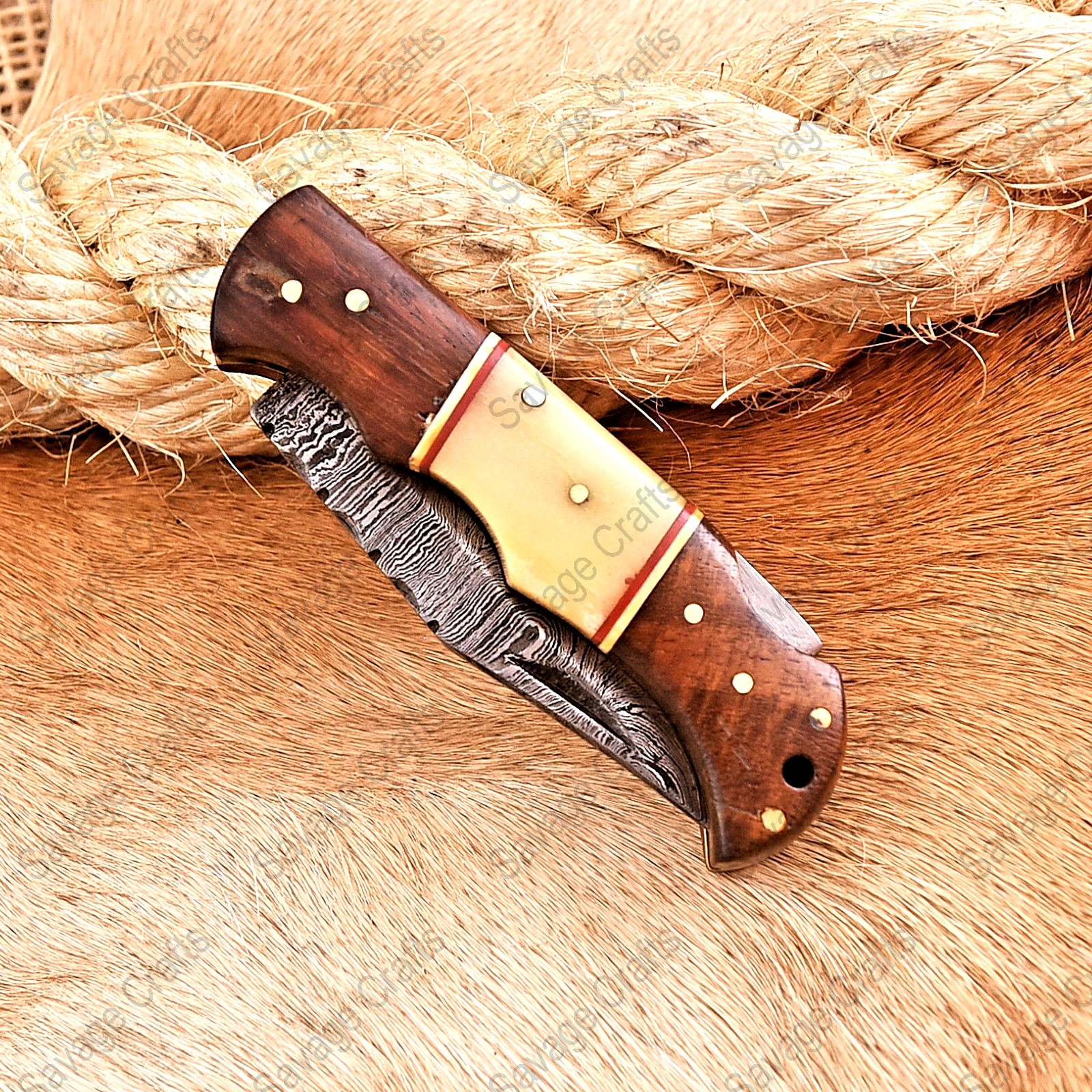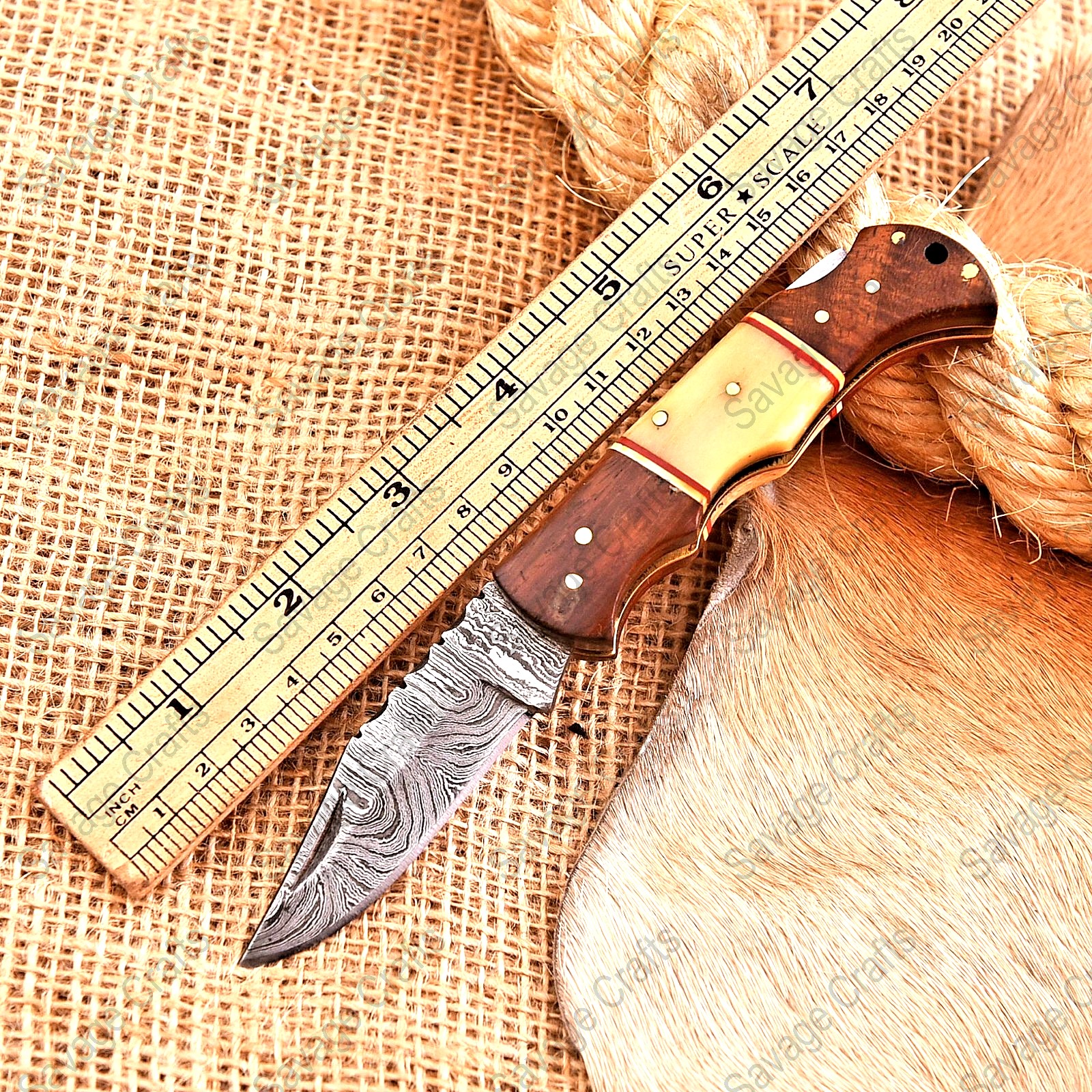 6.5″ Damascus Steel Folding/Pocket Knife – Bone & Wood