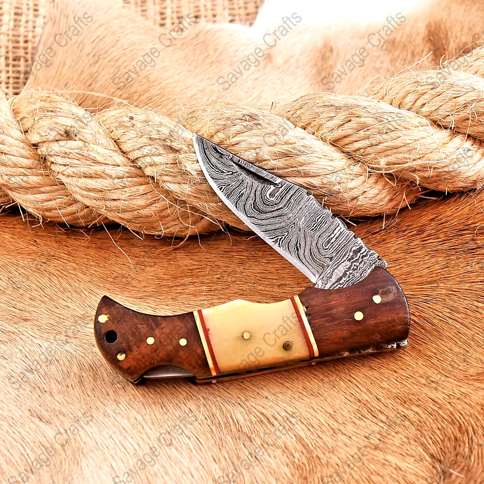 Crafted with an ultra-sharp, hand-forged Damascus steel blade, this folding knife exemplifies the enduring value of traditional metalworking. Damascus steel offers superior durability compared to standard high-carbon steels and allows for easier sharpening, thanks to its balanced blend of high-chromium and alloying elements.