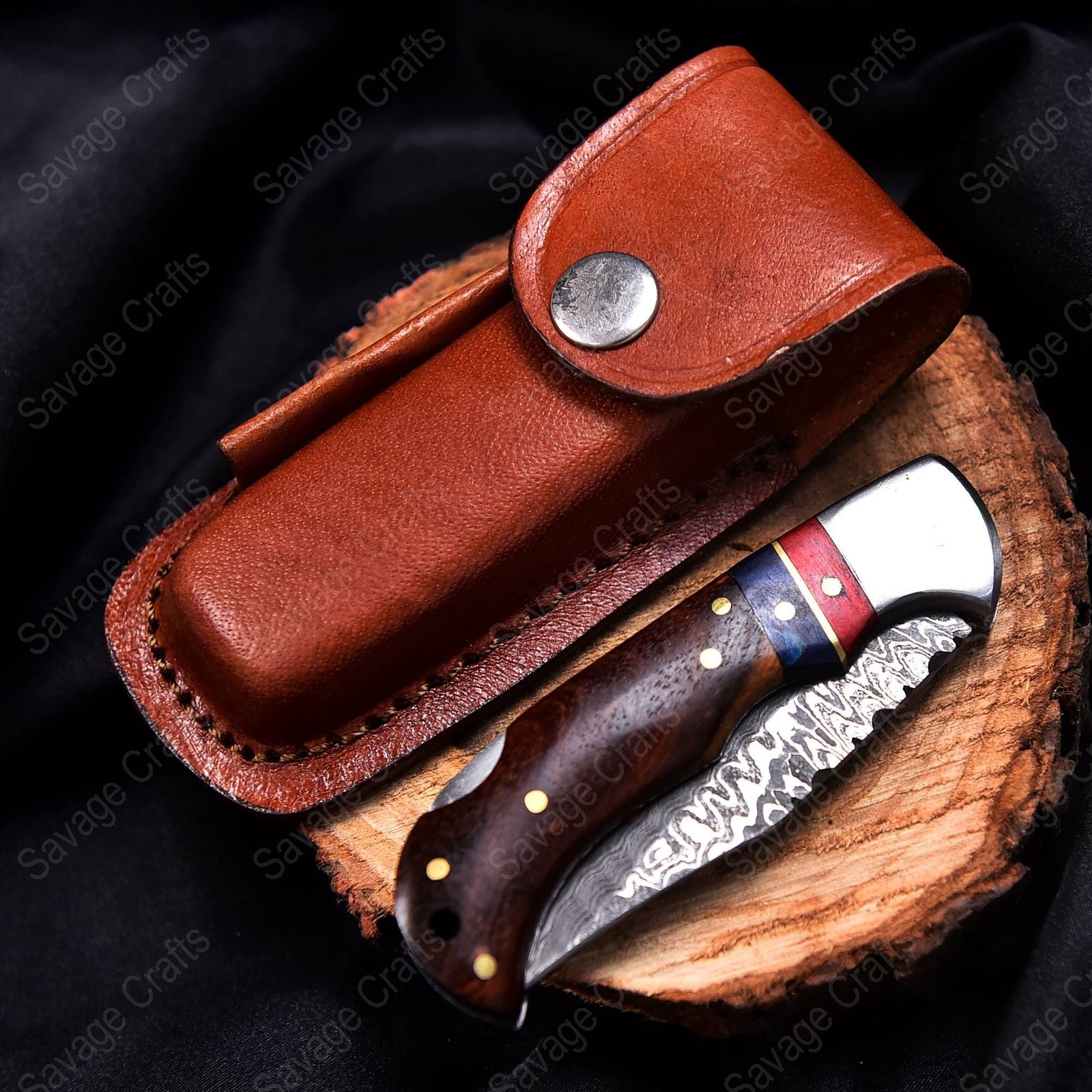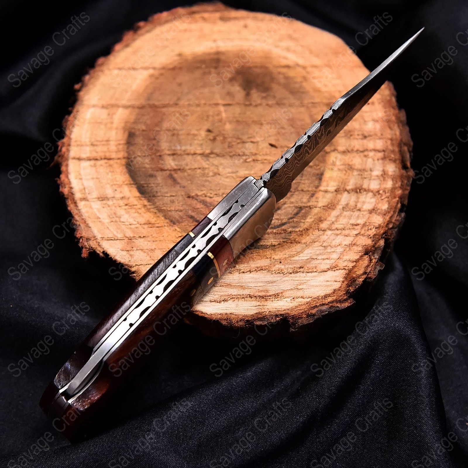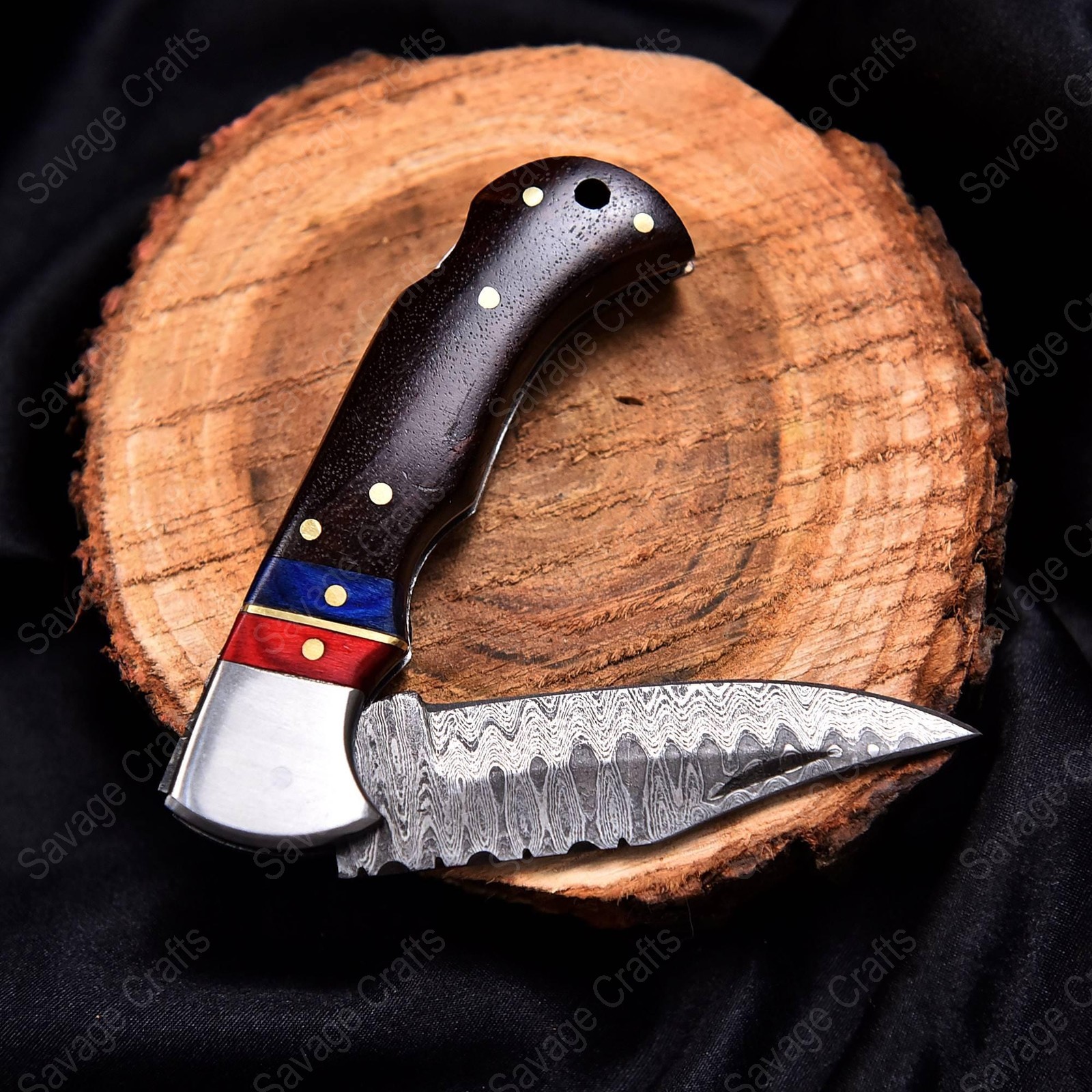 Crafted with an ultra-sharp, hand-forged Damascus steel blade, this folding knife exemplifies the enduring value of traditional metalworking. Damascus steel offers superior durability compared to standard high-carbon steels and allows for easier sharpening, thanks to its balanced blend of high-chromium and alloying elements.