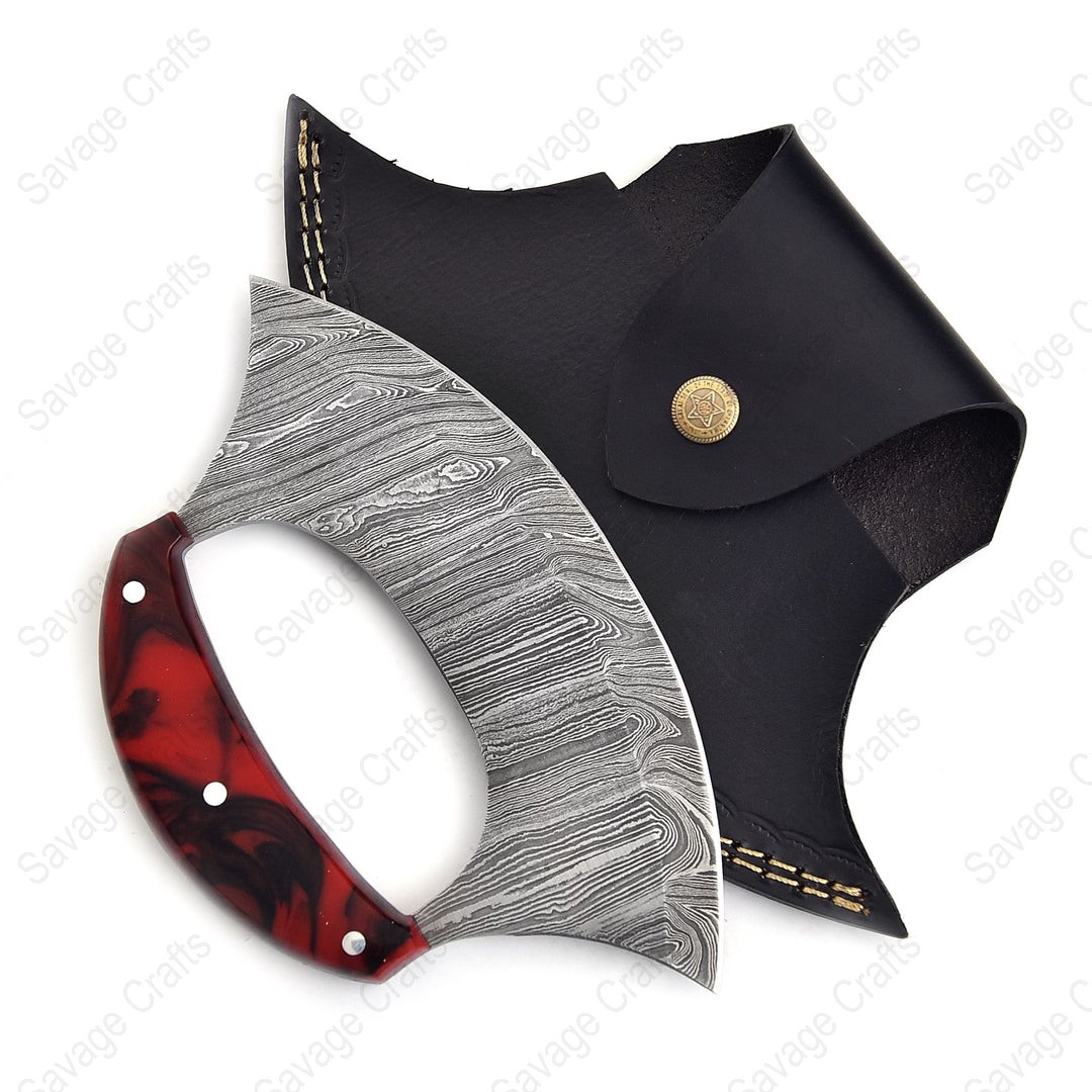 Crafted from swirling Damascus steel, this Ulu knife features a distinctive curved profile engineered for exceptional performance even in extreme cold. In everyday environments—such as the kitchen—its sweeping blade and ergonomically positioned handle provide outstanding control and efficiency for tasks like chopping garlic and herbs, slicing vegetables, and even cutting pizza.