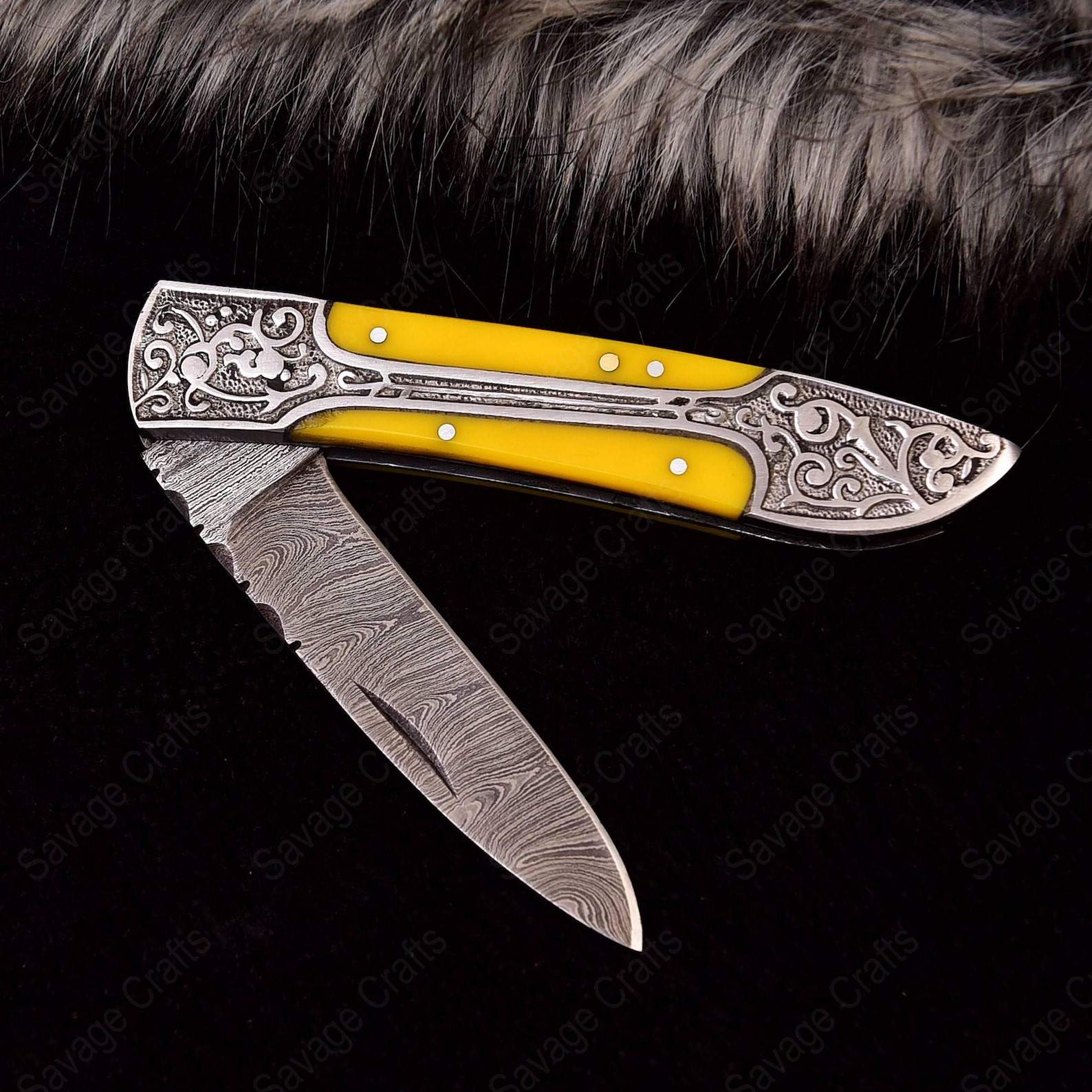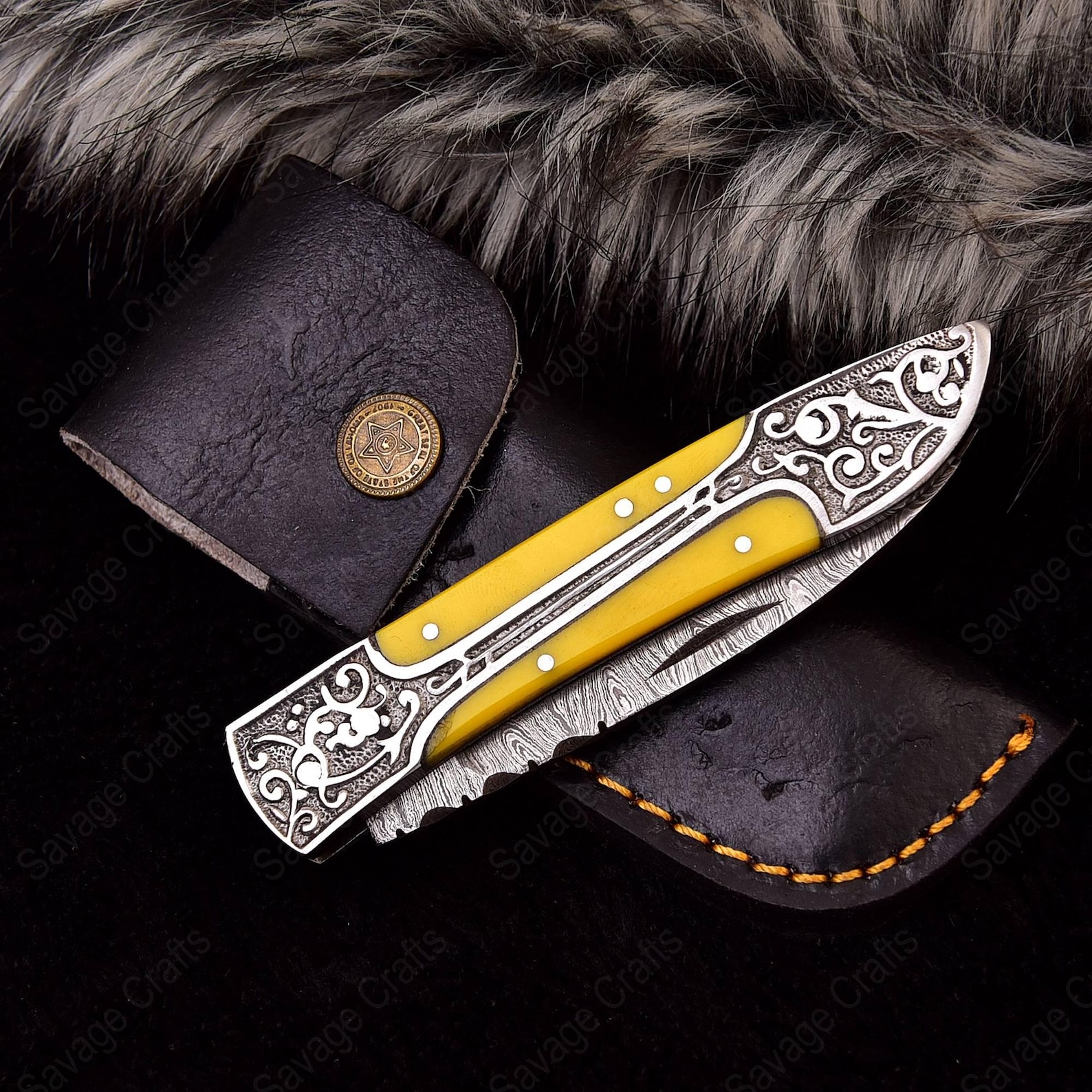 Crafted with an ultra-sharp, hand-forged Damascus steel blade, this folding knife exemplifies the enduring value of traditional metalworking. Damascus steel offers superior durability compared to standard high-carbon steels and allows for easier sharpening, thanks to its balanced blend of high-chromium and alloying elements.