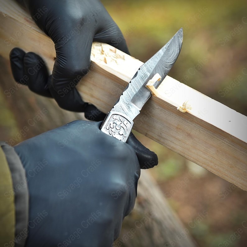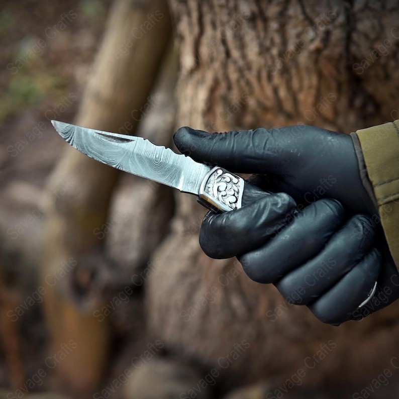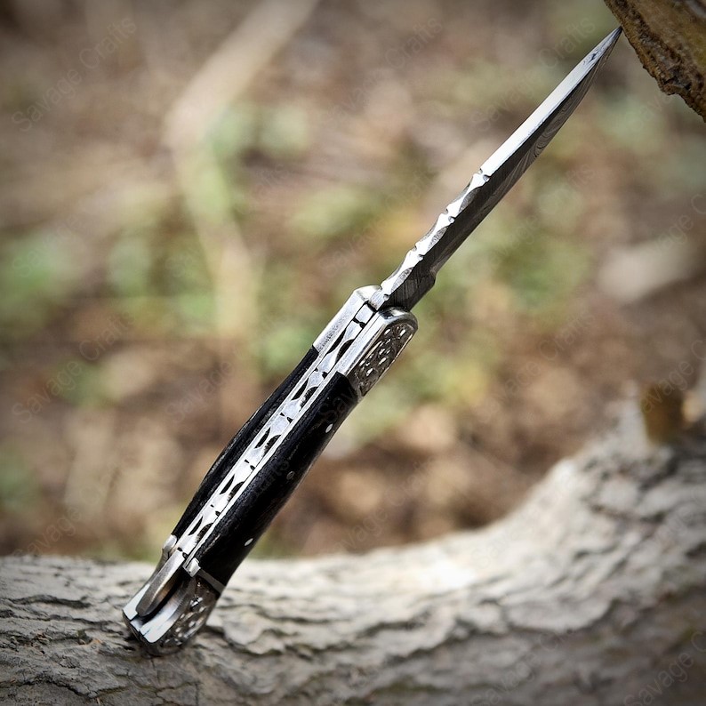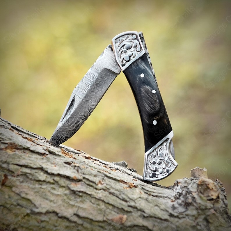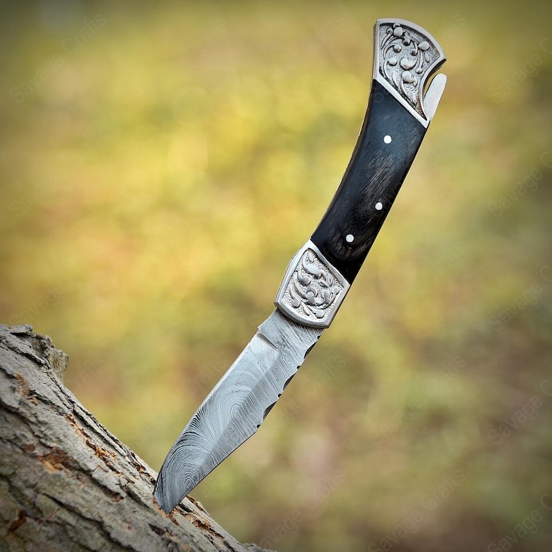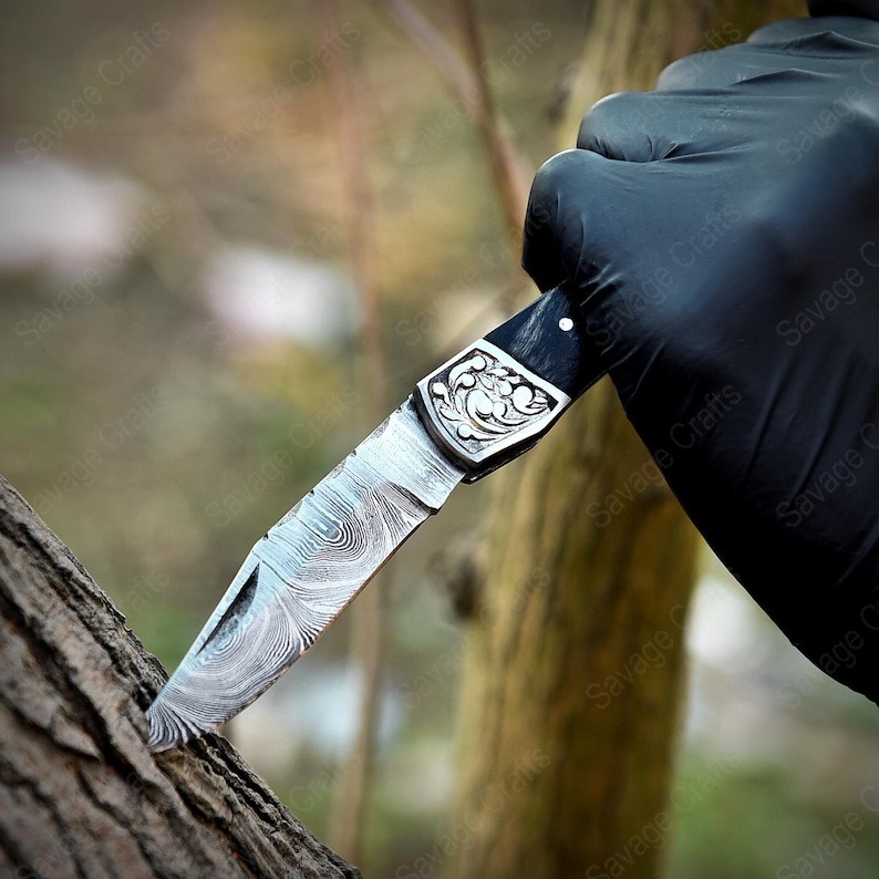 Crafted with an ultra-sharp, hand-forged Damascus steel blade, this folding knife exemplifies the enduring value of traditional metalworking. Damascus steel offers superior durability compared to standard high-carbon steels and allows for easier sharpening, thanks to its balanced blend of high-chromium and alloying elements.