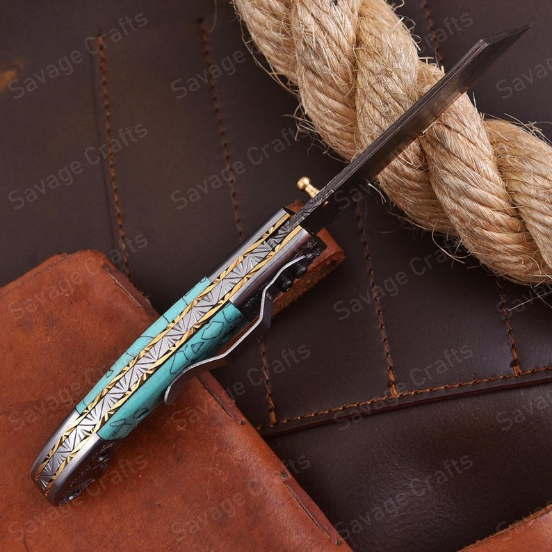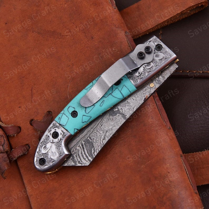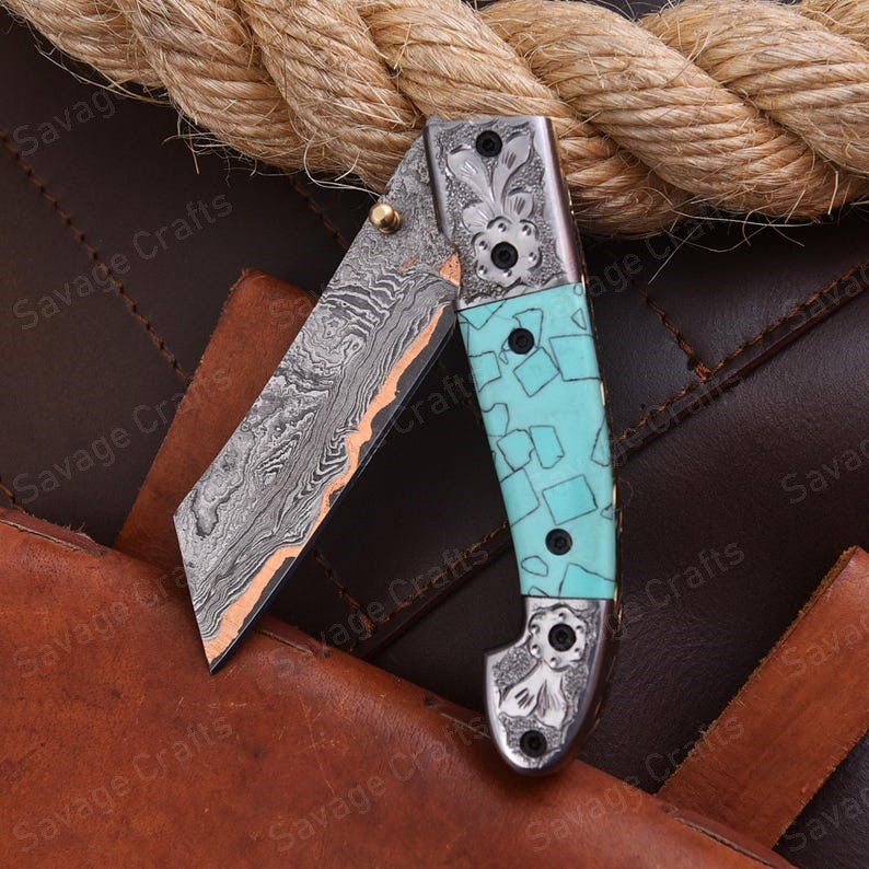 Crafted with an ultra-sharp, hand-forged Damascus steel blade, this folding knife exemplifies the enduring value of traditional metalworking. Damascus steel offers superior durability compared to standard high-carbon steels and allows for easier sharpening, thanks to its balanced blend of high-chromium and alloying elements.