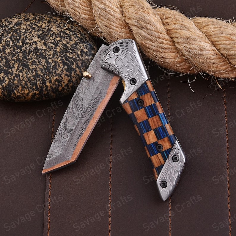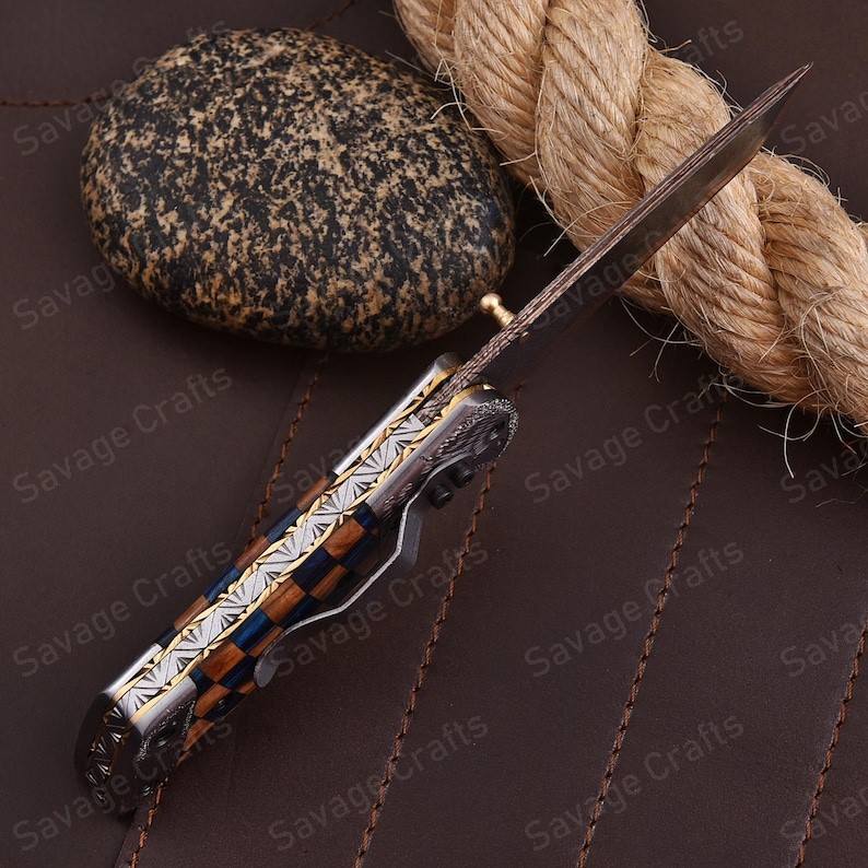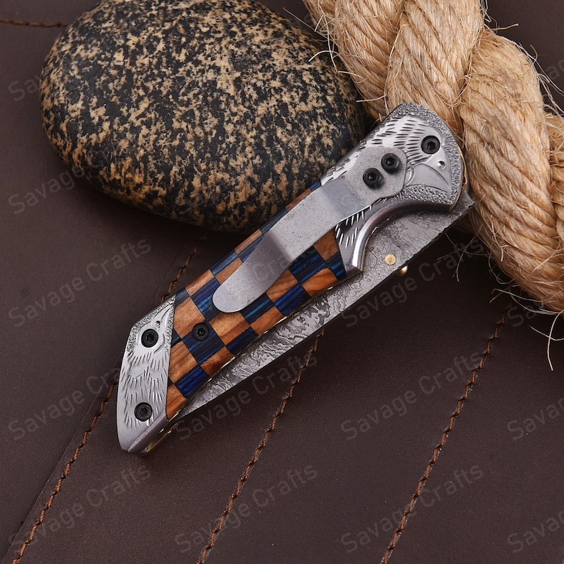 Crafted with an ultra-sharp, hand-forged Damascus steel blade, this folding knife exemplifies the enduring value of traditional metalworking. Damascus steel offers superior durability compared to standard high-carbon steels and allows for easier sharpening, thanks to its balanced blend of high-chromium and alloying elements.