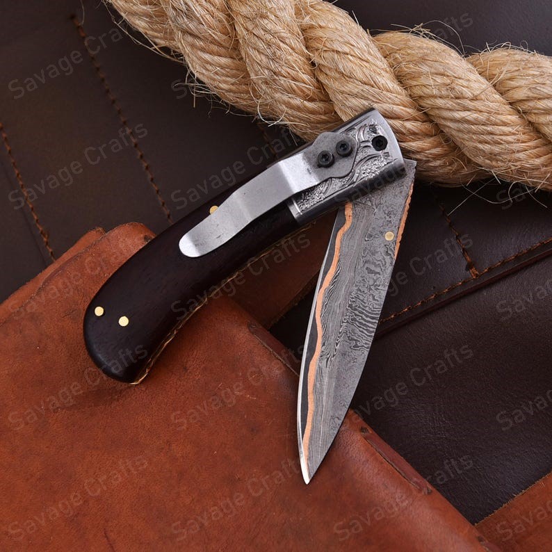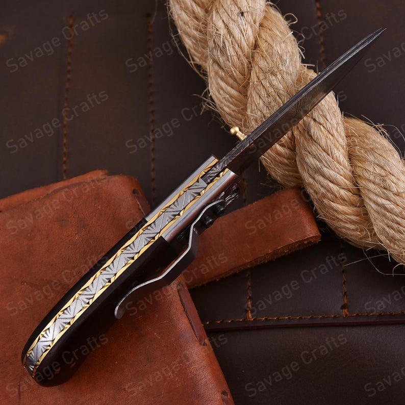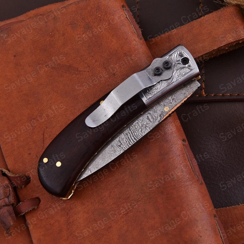 Crafted with an ultra-sharp, hand-forged Damascus steel blade, this folding knife exemplifies the enduring value of traditional metalworking. Damascus steel offers superior durability compared to standard high-carbon steels and allows for easier sharpening, thanks to its balanced blend of high-chromium and alloying elements.