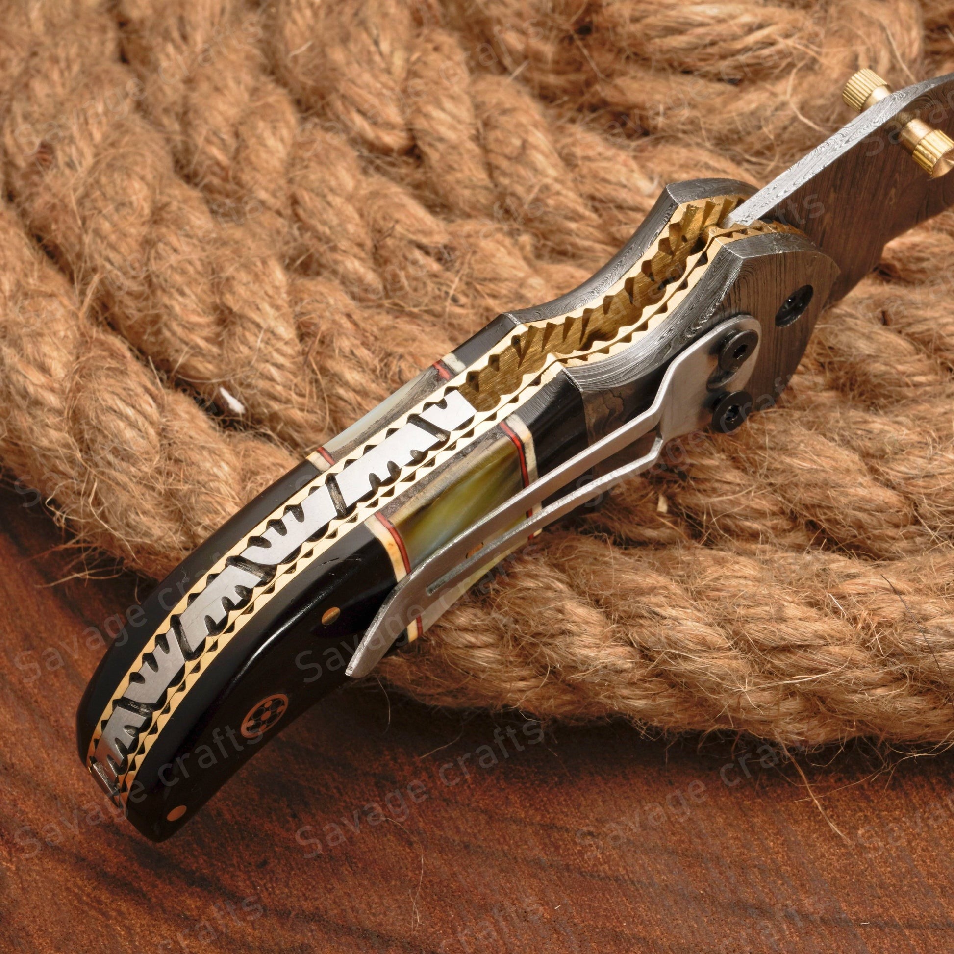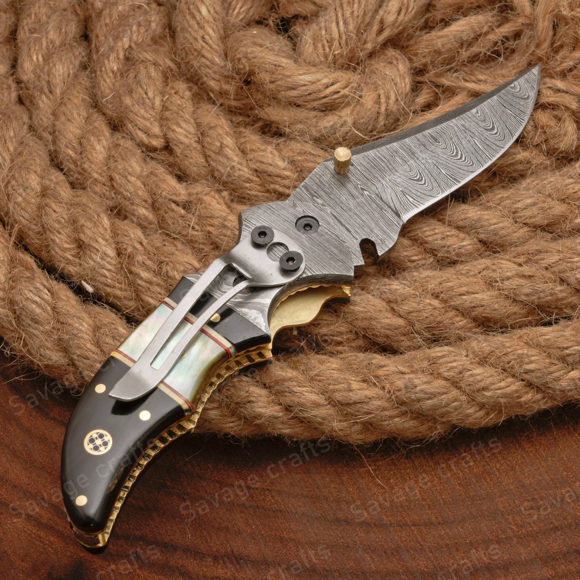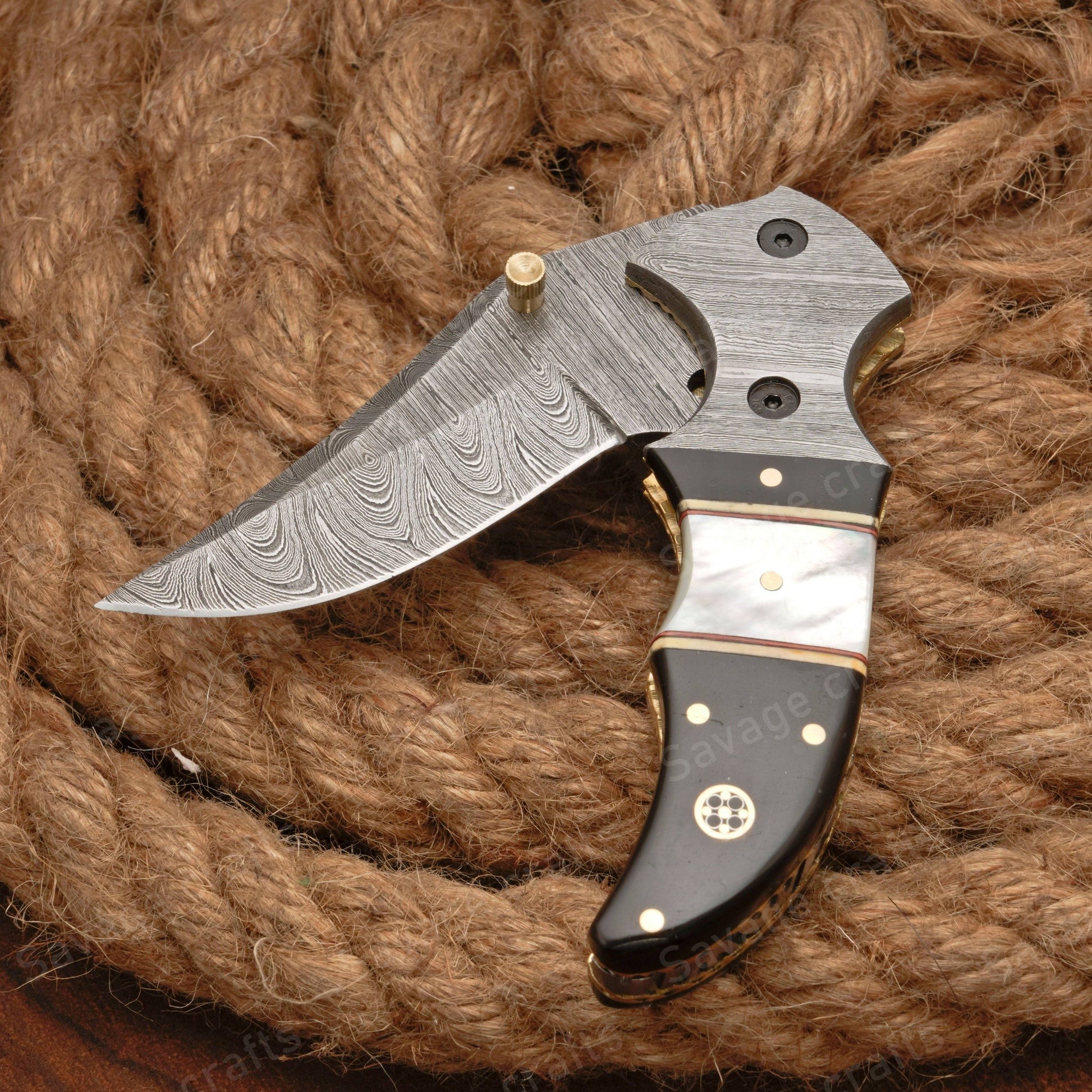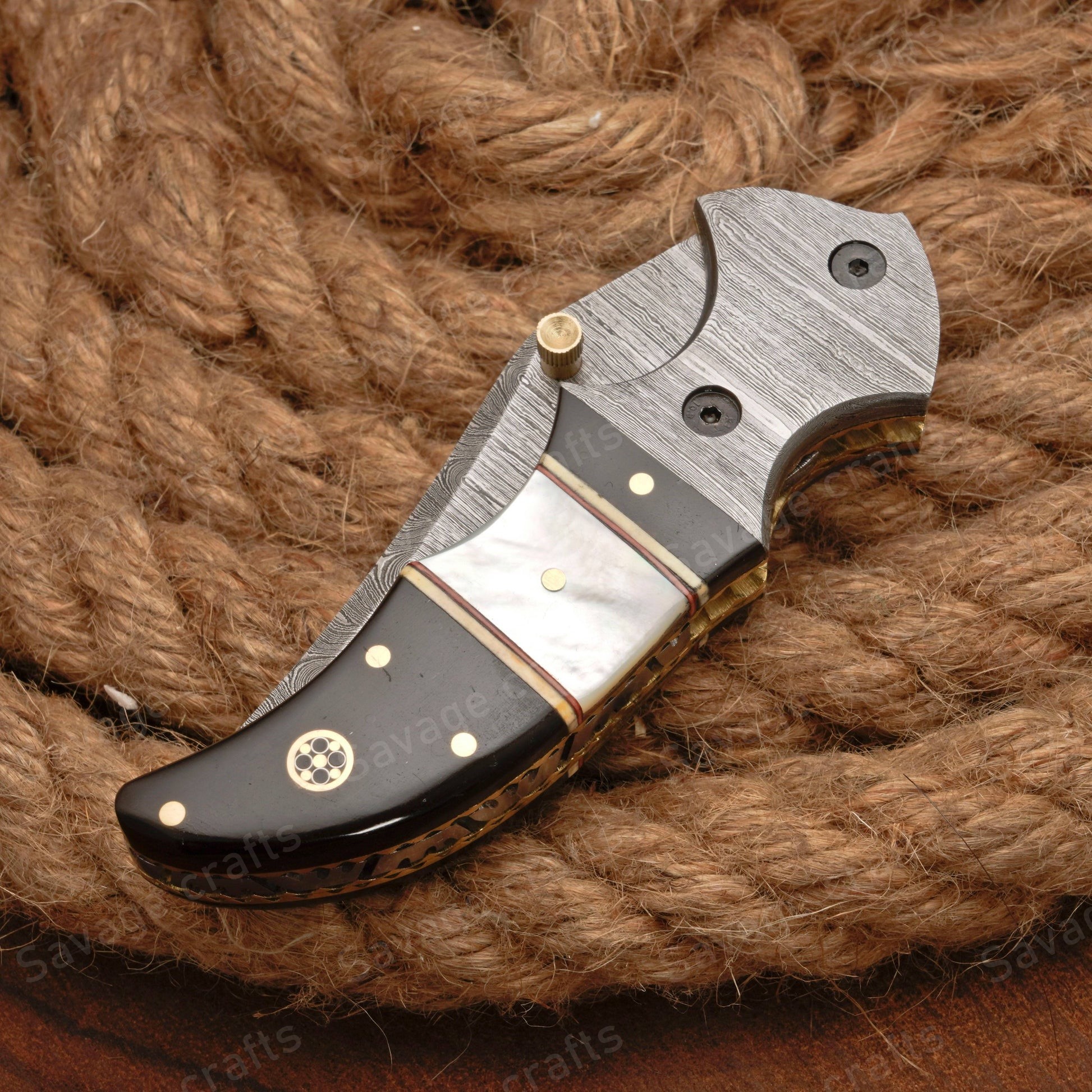 - Handle Material: Damascus Bolster, Buffalo Horn, Mother of Pearl, Pocket Clip