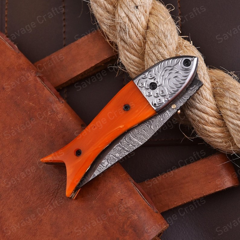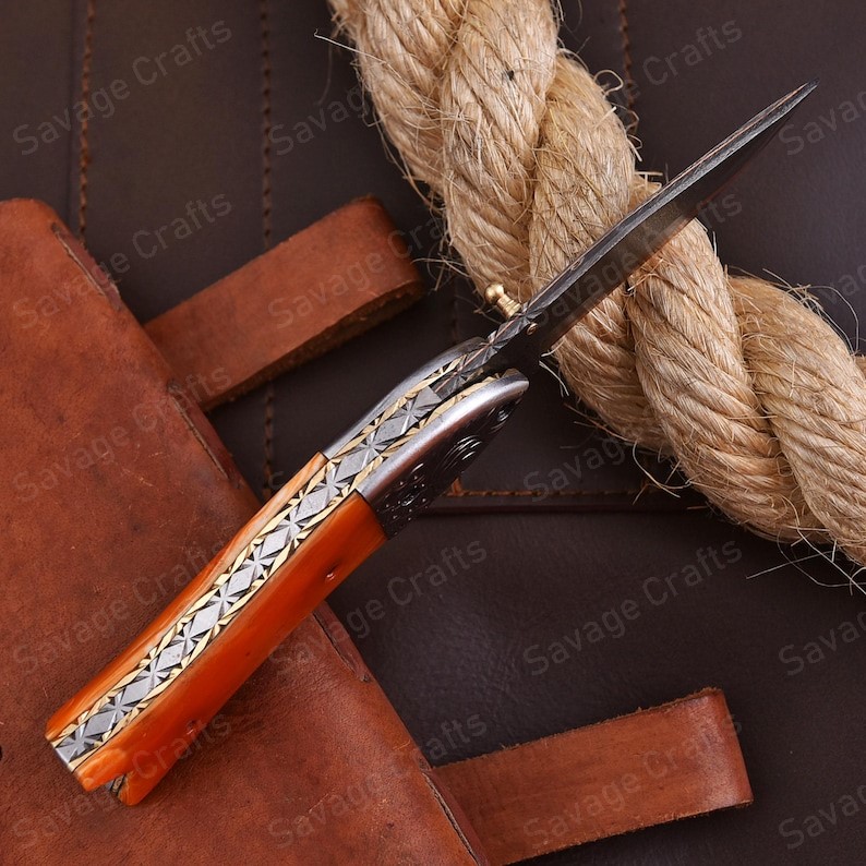 Crafted with an ultra-sharp, hand-forged Damascus steel blade, this folding knife exemplifies the enduring value of traditional metalworking. Damascus steel offers superior durability compared to standard high-carbon steels and allows for easier sharpening, thanks to its balanced blend of high-chromium and alloying elements.