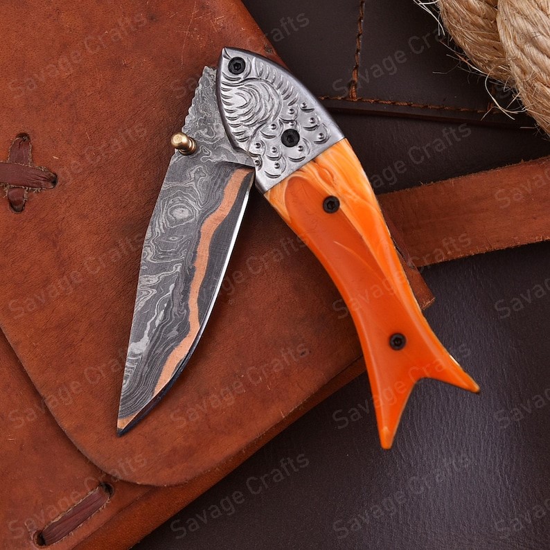 You're viewing: 8″ Handmade Copper Damascus Steel Folding/Pocket Knife – Resin Handle $ 99.00