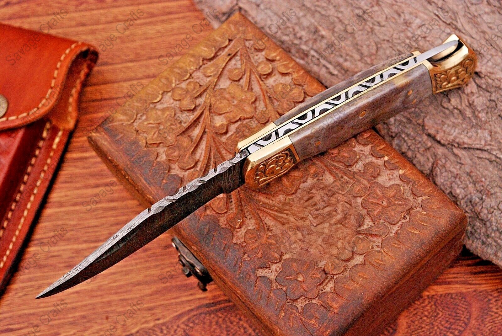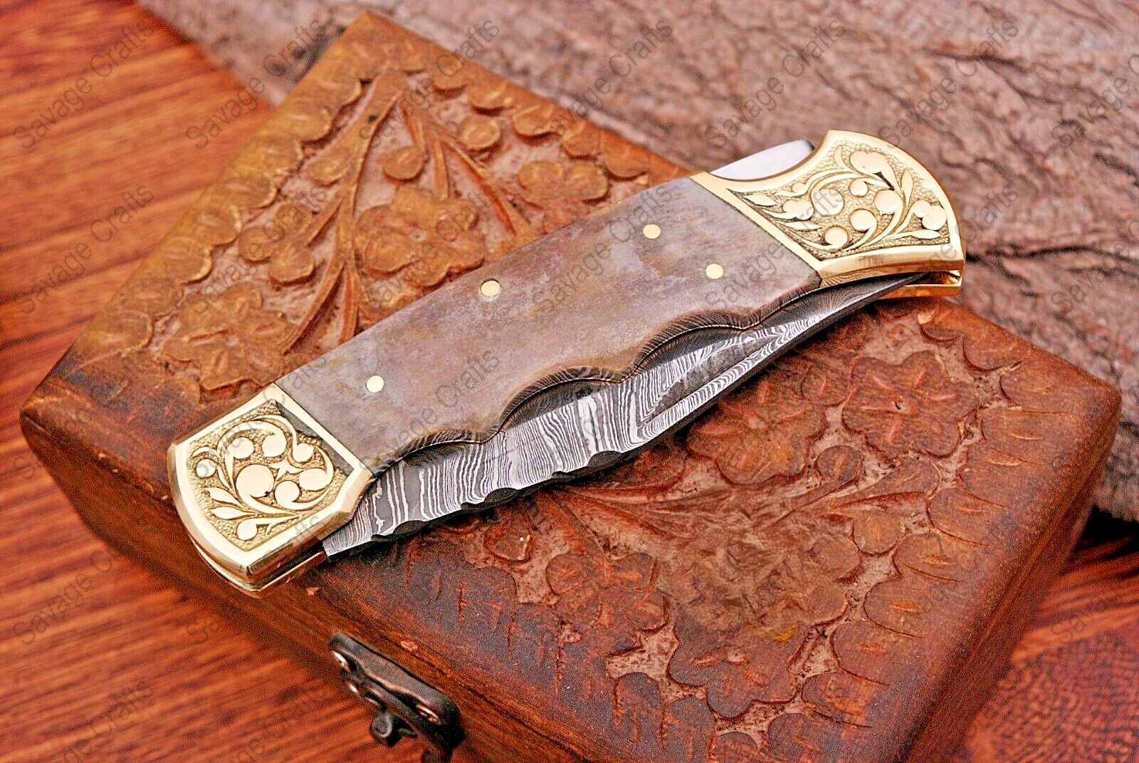 Crafted with an ultra-sharp, hand-forged Damascus steel blade, this folding knife exemplifies the enduring value of traditional metalworking. Damascus steel offers superior durability compared to standard high-carbon steels and allows for easier sharpening, thanks to its balanced blend of high-chromium and alloying elements.