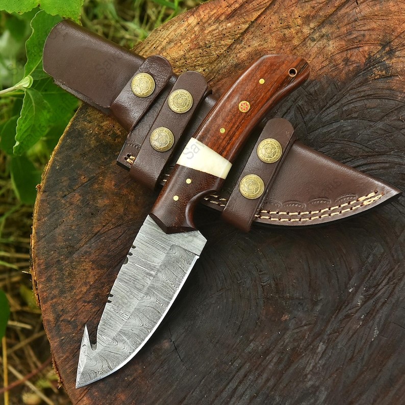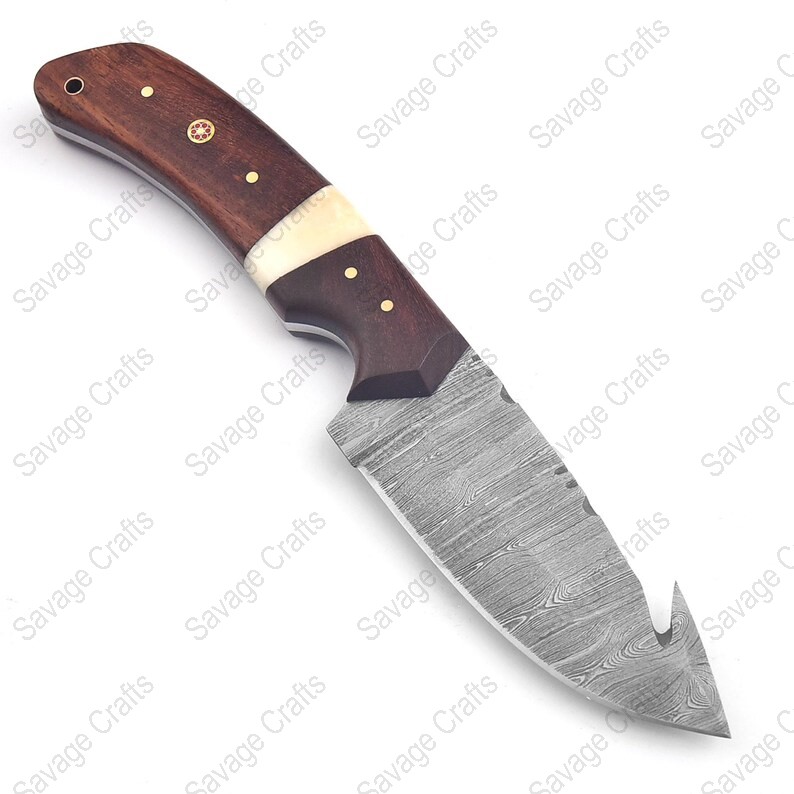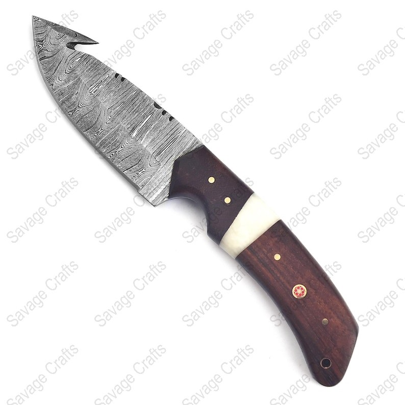 9″ Damascus Guthook Skinner Knife – Wood Handle