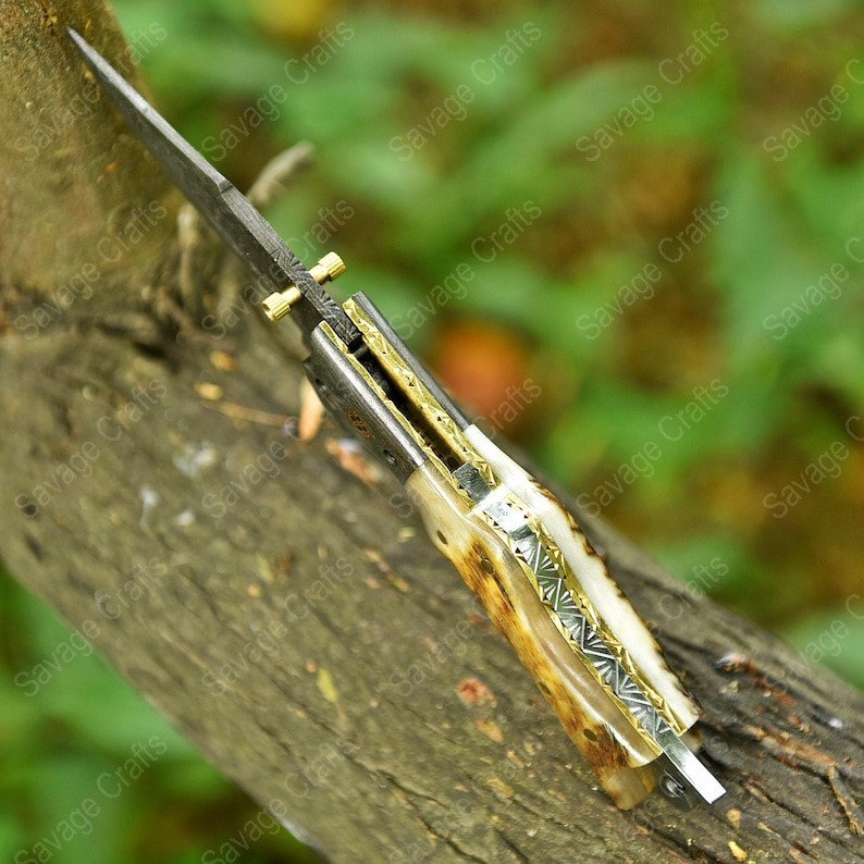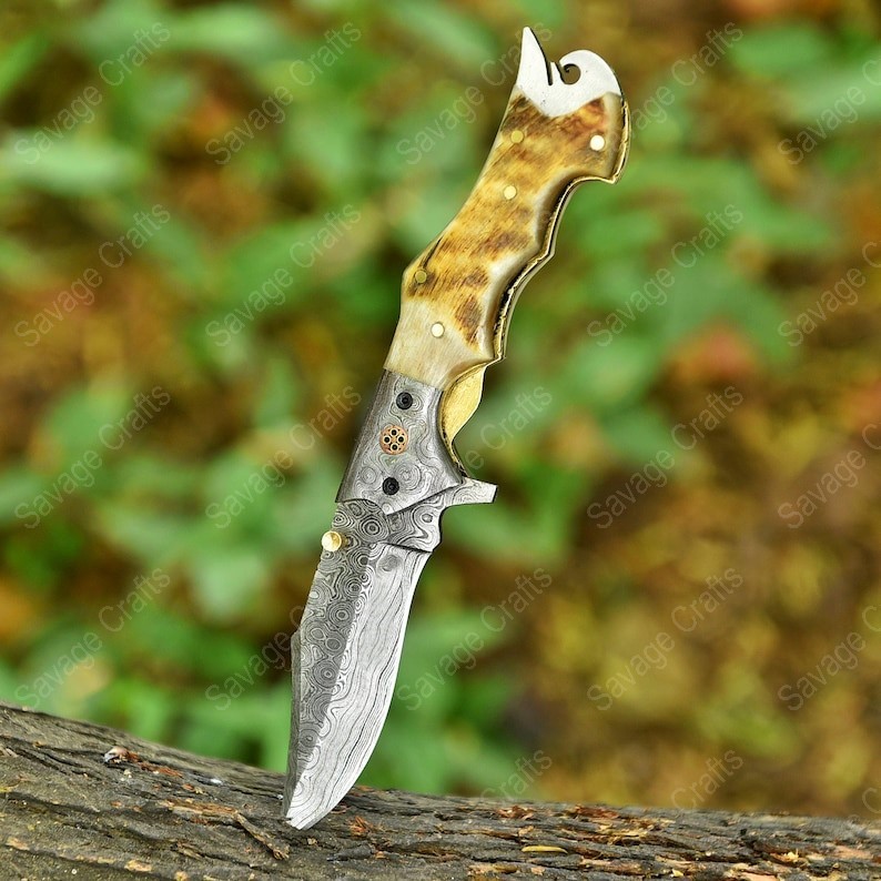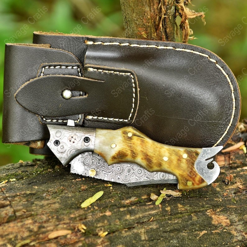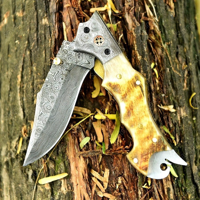 Crafted with an ultra-sharp, hand-forged Damascus steel blade, this folding knife exemplifies the enduring value of traditional metalworking. Damascus steel offers superior durability compared to standard high-carbon steels and allows for easier sharpening, thanks to its balanced blend of high-chromium and alloying elements.