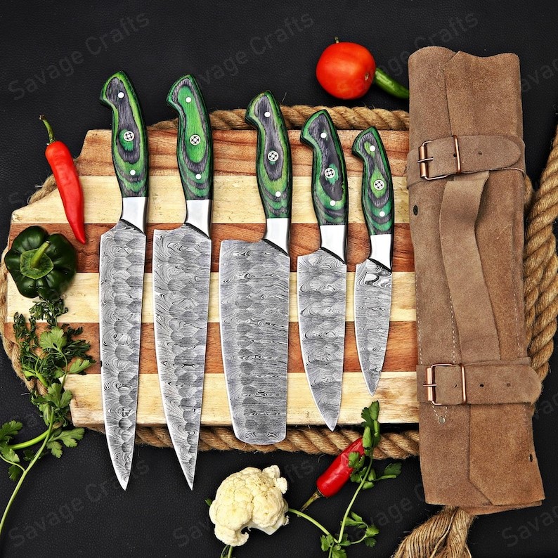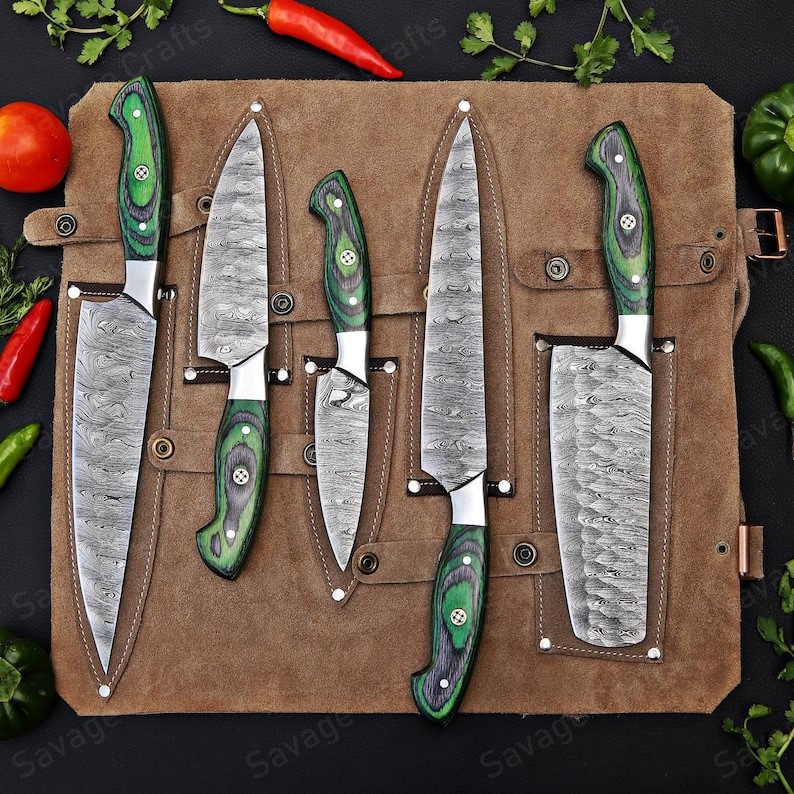 Experience the ultimate in kitchen performance with this premium knife set, thoughtfully curated to cover all your culinary needs and presented in a purpose-designed leather roll bag for secure, elegant storage. The collection includes three chef’s knives in graduated sizes, each engineered to deliver the perfect balance between power and precision for every stage of food preparation. A finely crafted paring knife adds accuracy for detailed tasks such as peeling, seeding, garnishing, and other intricate cuts, while a dedicated vegetable cleaver ensures fast, effortless chopping of produce. Every blade is forged from 264 layers of hand-crafted Damascus steel and oil-quenched for exceptional strength, sharpness, and durability. Complemented by handles made from Micarta, these knives offer both outstanding performance and a striking aesthetic that elevates any kitchen.
