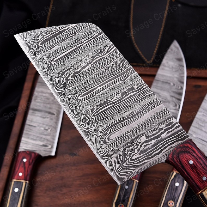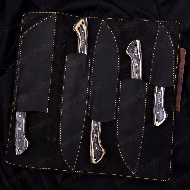 Experience the ultimate in kitchen performance with this premium knife set, thoughtfully curated to cover all your culinary needs and presented in a purpose-designed leather roll bag for secure, elegant storage. The collection includes three chef’s knives in graduated sizes, each engineered to deliver the perfect balance between power and precision for every stage of food preparation. A finely crafted paring knife adds accuracy for detailed tasks such as peeling, seeding, garnishing, and other intricate cuts, while a dedicated vegetable cleaver ensures fast, effortless chopping of produce. Every blade is forged from 264 layers of hand-crafted Damascus steel and oil-quenched for exceptional strength, sharpness, and durability. Complemented by handles made from Micarta, these knives offer both outstanding performance and a striking aesthetic that elevates any kitchen.