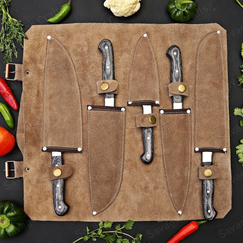 Experience the ultimate in kitchen performance with this premium knife set, thoughtfully curated to cover all your culinary needs and presented in a purpose-designed leather roll bag for secure, elegant storage. The collection includes three chef’s knives in graduated sizes, each engineered to deliver the perfect balance between power and precision for every stage of food preparation. A finely crafted paring knife adds accuracy for detailed tasks such as peeling, seeding, garnishing, and other intricate cuts, while a dedicated vegetable cleaver ensures fast, effortless chopping of produce. Every blade is forged from 264 layers of hand-crafted Damascus steel and oil-quenched for exceptional strength, sharpness, and durability. Complemented by handles made from Micarta, these knives offer both outstanding performance and a striking aesthetic that elevates any kitchen.